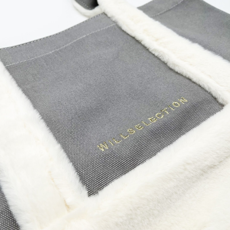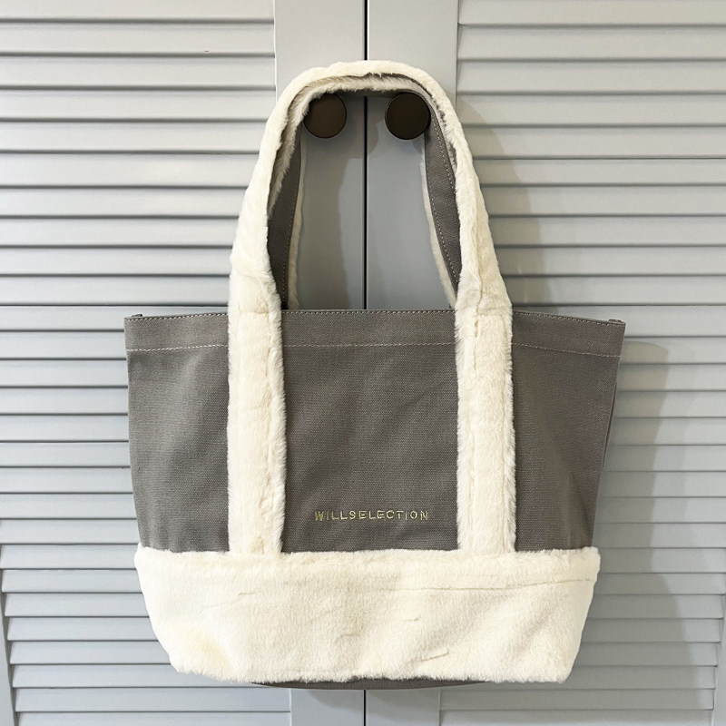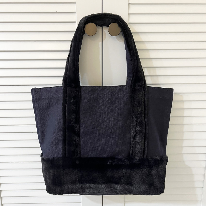 Crafted from durable pure cotton canvas that maintains its structured shape through daily use, this bag offers reliable tear resistance and longevity. The soft plush fleece patchwork provides warmth and visual texture, perfectly suited for colder months. Precision stitching ensures clean edge finishing and secure attachment between materials. An interior slip pocket keeps small items like phones and keys organized. The gold embroidered brand logo adds understated elegance.