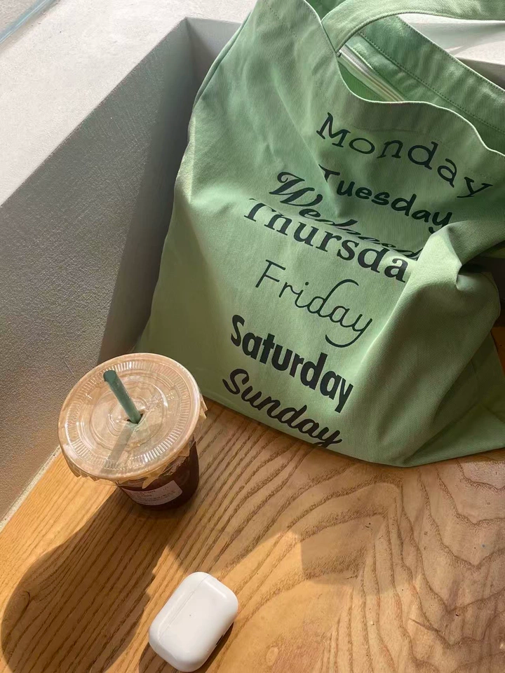 Thoughtful details include a convenient interior zippered pocket to secure small essentials like phones and keys, and comfortable dual handles with a 62cm length for easy over-the-shoulder carry. This casual canvas shopper bag is more than just a bag; it's a practical companion for students, commuters, and eco-conscious shoppers. We offer this popular style for canvas tote bag wholesale and custom letter tote bag orders, allowing you to customize the weekday text, color, and pocket configuration to create a unique product for your store or brand.