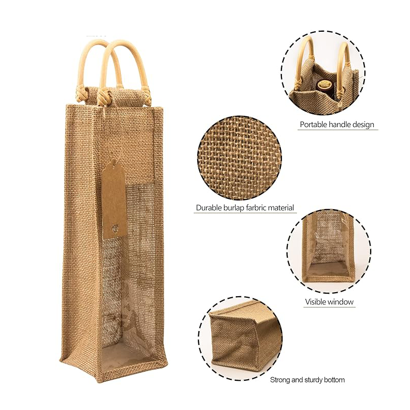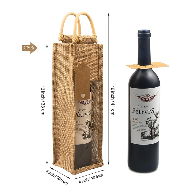 Crafted from premium natural burlap fabric with a stylish clear window, our Burlap Wine Gift Bag 2-pack brings rustic elegance to any occasion. Featuring sturdy wooden handles, reinforced dividers, and included kraft tags + hemp rope, each rustic jute bottle bag perfectly fits standard 750ml bottles. Reusable, washable, and fully customizable—ideal for weddings, parties, holidays, or branded gifting while keeping your wine safe and beautifully presented.