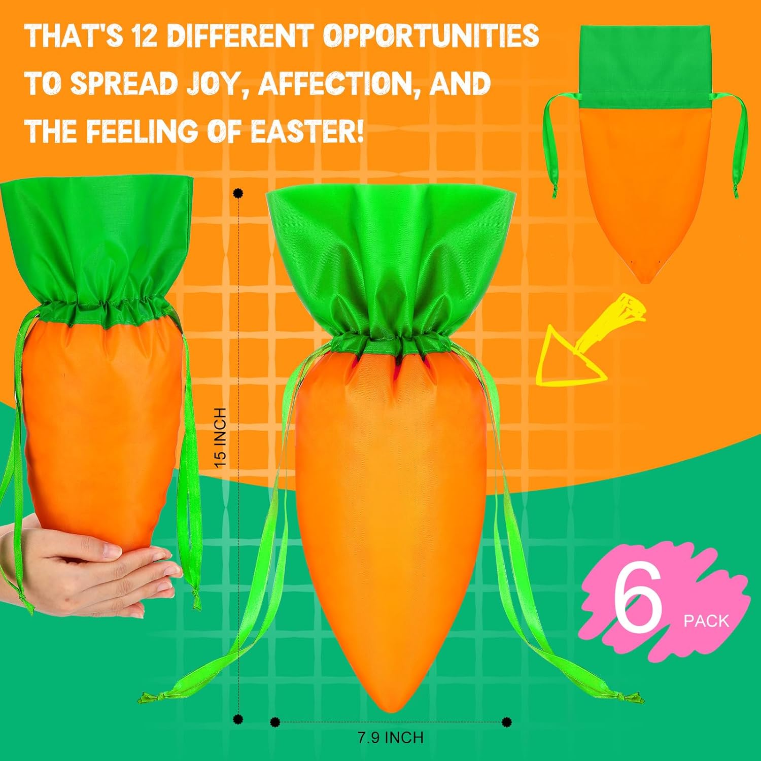 Fill these carrot bags with decorated eggs, chocolates, and small toys for children to discover during spring egg hunts. The generous size holds plenty of treats, and the festive shape adds to the excitement of the holiday.