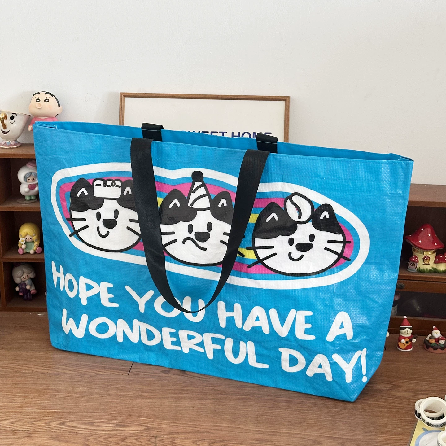 Brighten every outing with our irresistibly cheerful bright blue happy cat tote bag Designed to spark smiles and handle heavy loads this bag combines playful artistry with serious utility Crafted from resilient PP woven fabric it achieves an ideal balance of being remarkably lightweight and highly tear resistant ensuring it can be reused countless times The standout design features a trio of charming black and white cartoon cats with fun accessories set against a lively pink yellow and blue backdrop along with the uplifting phrase HOPE YOU HAVE A WONDERFUL DAY turning a simple bag into a mood boosting accessory.