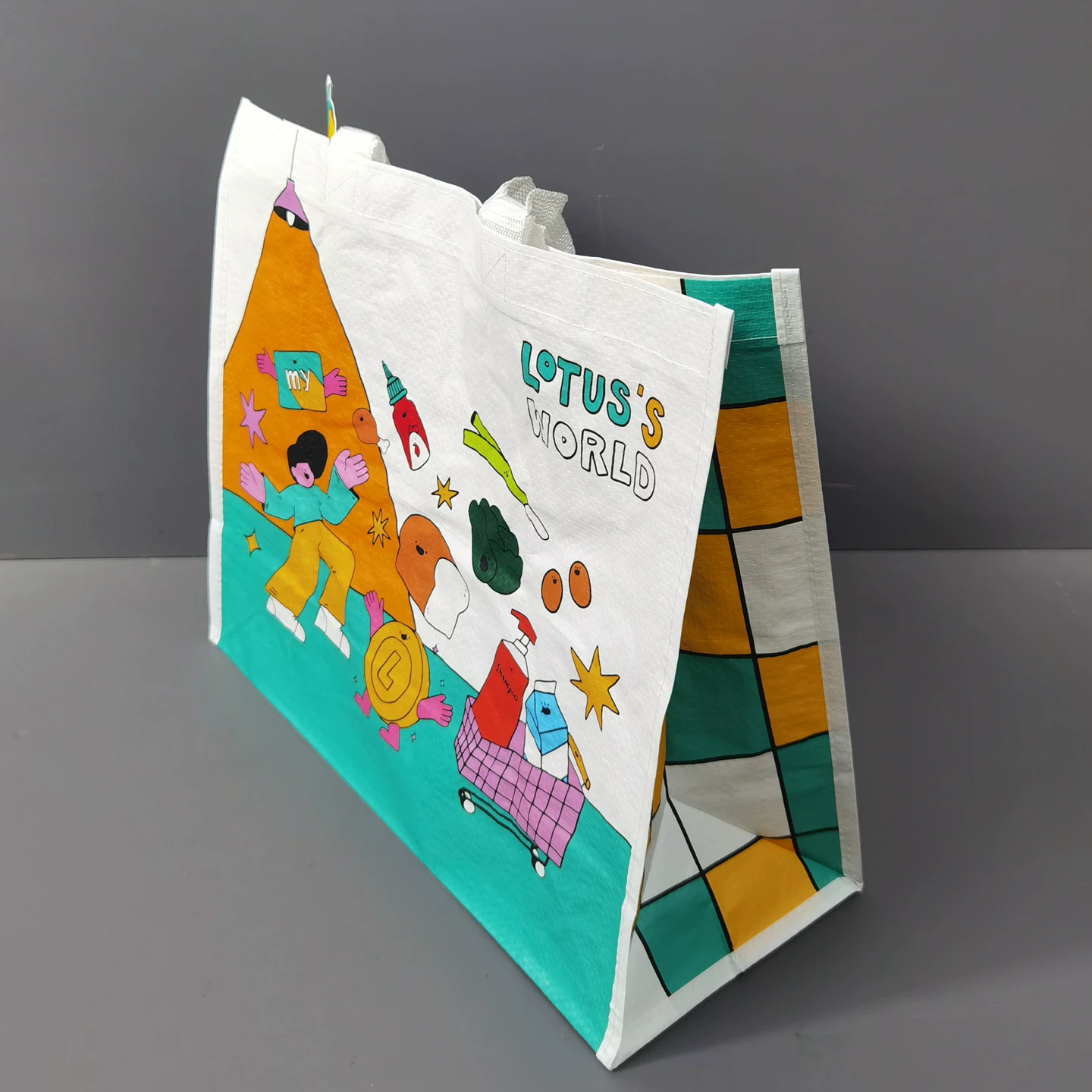 The bag features high definition UV digital printing that delivers vibrant colors and crisp lines for complex illustrations. The example "LOTUS'S WORLD" design showcases a lively shopping themed scene on the front with a simplified character illustration on the back, creating a cohesive playful aesthetic. The printing maintains fade resistance through repeated use with excellent color saturation. Fully customizable through OEM and ODM services, this bag supports replacement of the cartoon design with brand logos, text, or custom patterns using UV digital or screen printing techniques.