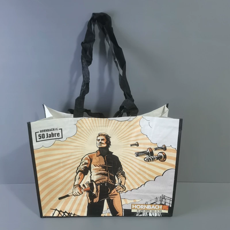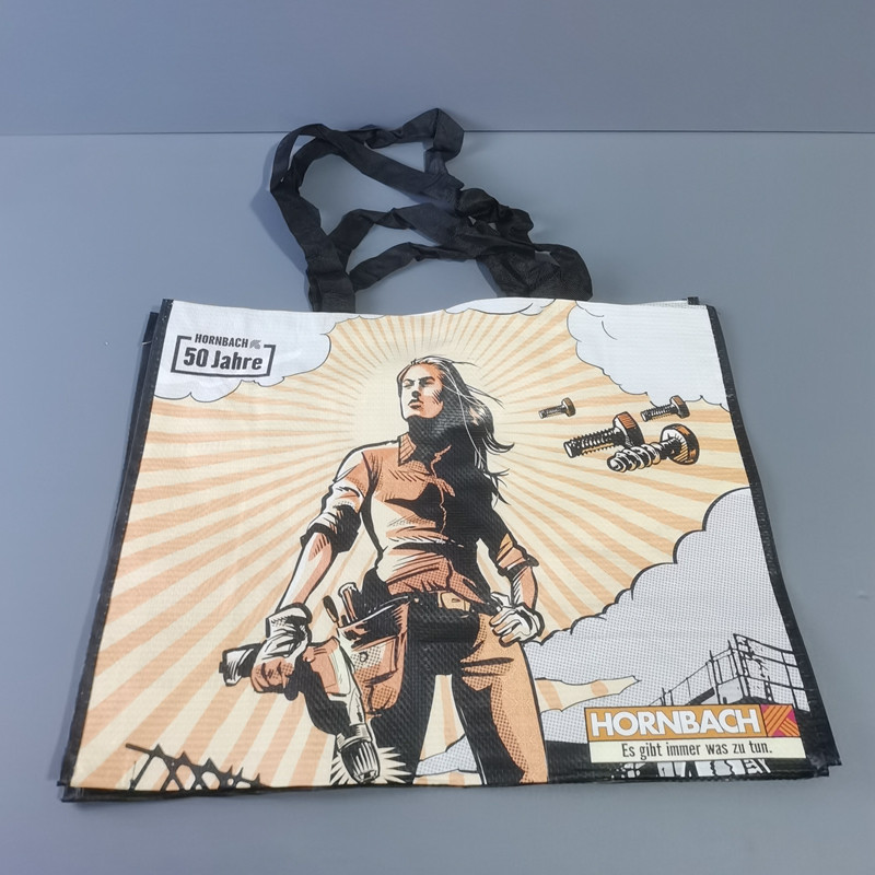 The exterior commemorates HORNBACH's 50th anniversary with bold retro style illustrations on each side, featuring male and female workers with tools that embody a dynamic industrial aesthetic. High saturation UV digital printing delivers crisp lines and bright hues that remain fade resistant through repeated use. Front and back panels display "HORNBACH 50 Jahre" and "Es gibt immer was zu tun" text reinforcing brand heritage, while side panels feature "Danke für 50 Jahre gemeinsame Projekte" to honor customer partnerships. Fully customizable through OEM and ODM services, this bag supports replacement of the anniversary illustrations and branding with custom logos, text, or patterns using UV digital or screen printing techniques.