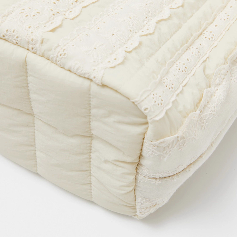 The polyester lace accent is selected for its durability and integrated as a design element, not just an appliqué. It is securely attached during the quilting process. While delicate in appearance, it is designed to withstand normal daily use. We recommend avoiding sharp snags or rough abrasion to preserve its beauty.