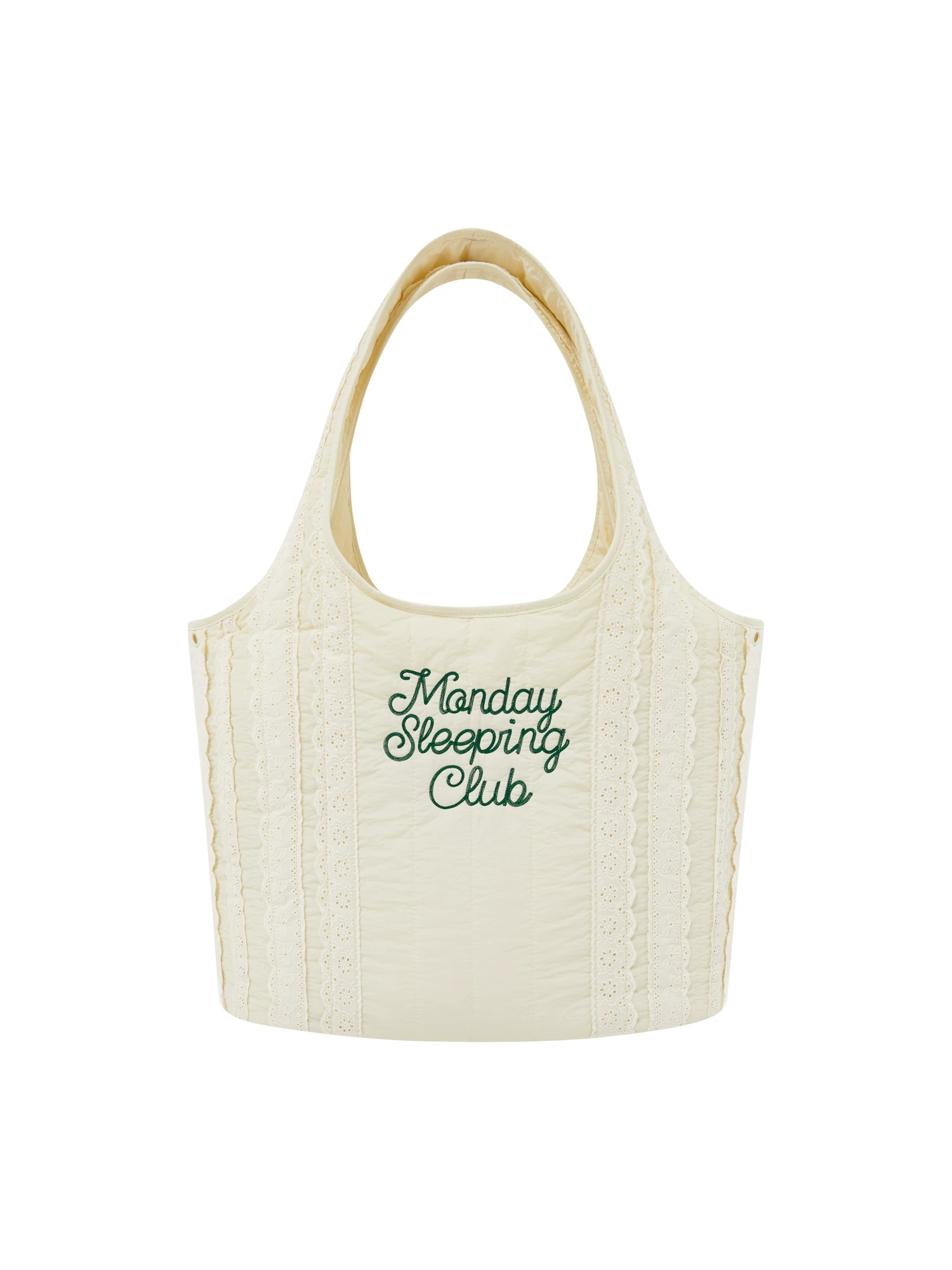 Introducing the Quilted Puffer Vest Sling Bag, a unique fusion of comfort and style that reimagines the everyday shoulder bag. Inspired by the relaxed shape of a cozy pillow, this bag features a soft, padded construction filled with plush silk-cotton, offering a delightfully slouchy and tactile feel. The exterior is crafted from durable, water-resistant nylon, ensuring protection from daily splashes. A signature cursive chain-stitch embroidery of the brand's monogram graces the front, adding an artisanal, personal touch. The design is elevated with a delicate lace trim detail, which introduces a layer of vintage-inspired, romantic texture and plays with light, perfectly capturing a sense of effortless elegance and laid-back charm.