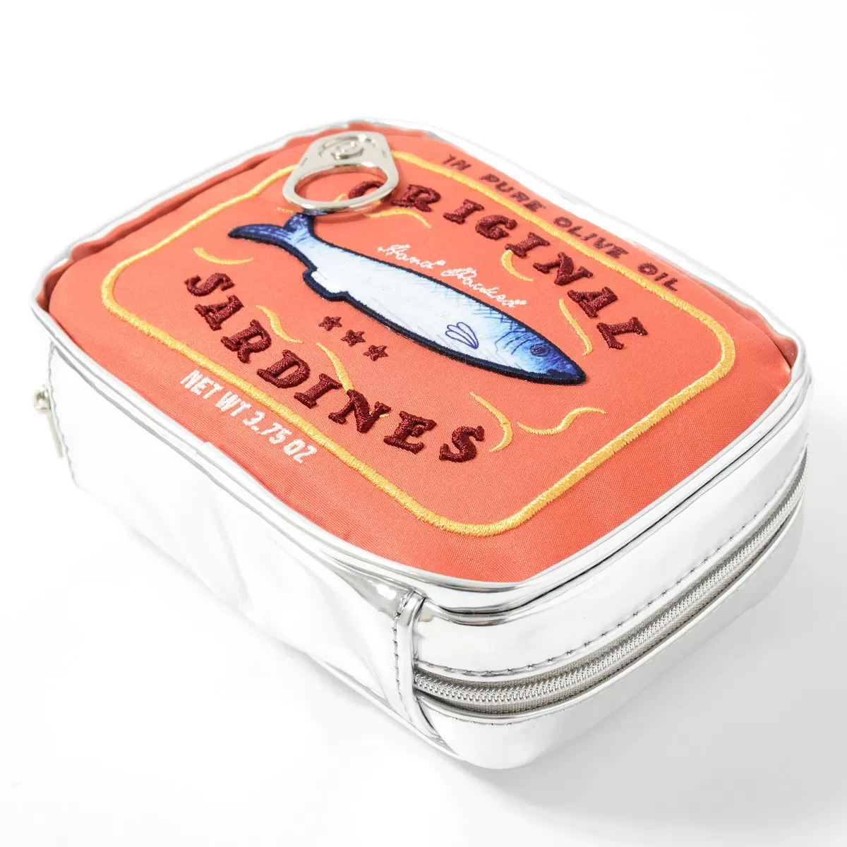 Crafted from embroidered fabric on the front with a bright silver simulated metal backing, this pouch offers unique texture and water resistance. Horizontal quilting creates a structured rectangular shape resembling a real sardine can. The front features detailed embroidery of sardine patterns, wave motifs, and vintage English text, while a metal pull tab mimics a can opener for added whimsy. A smooth zipper provides secure access, and an interior slip pocket organizes small items.