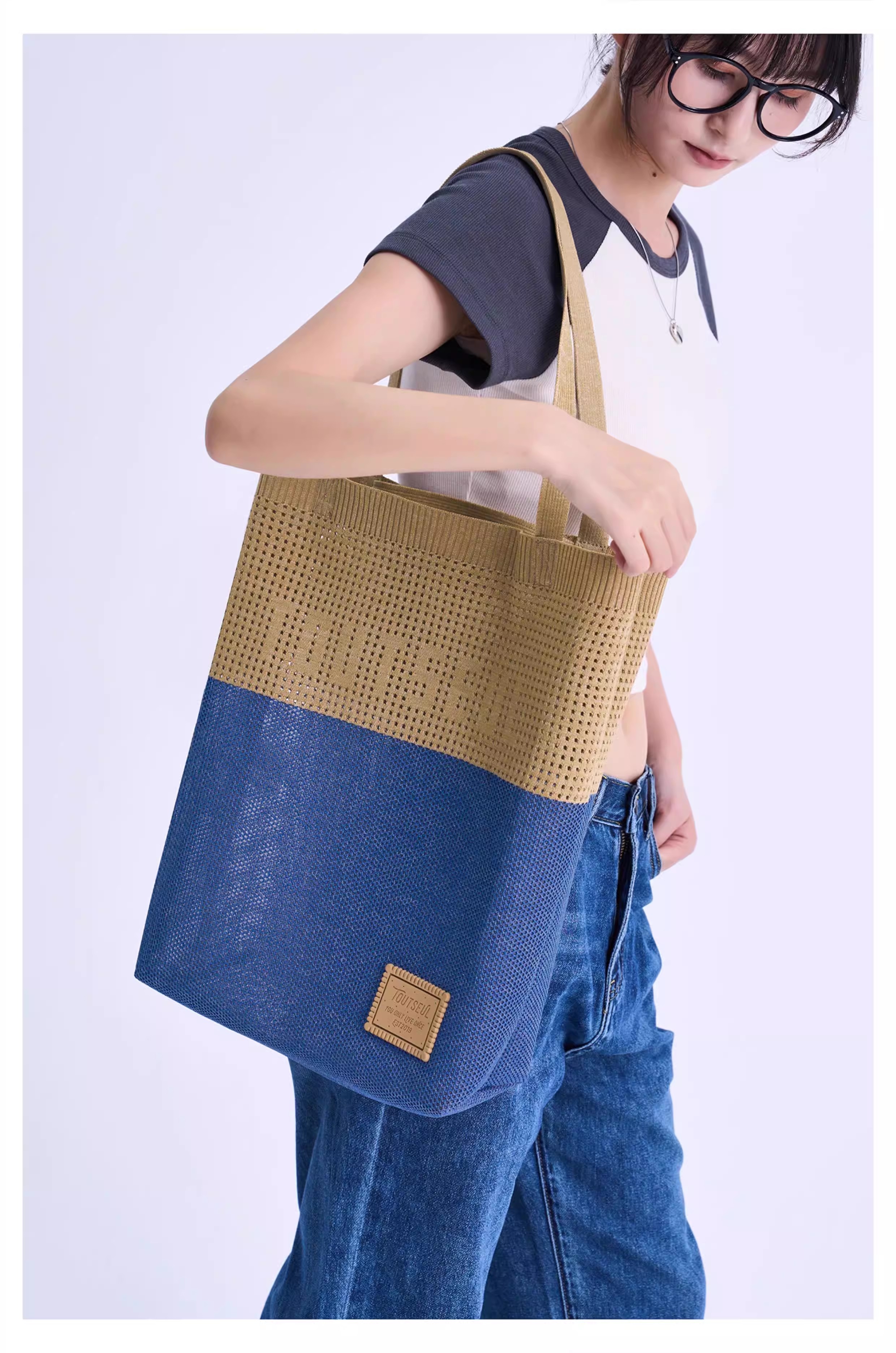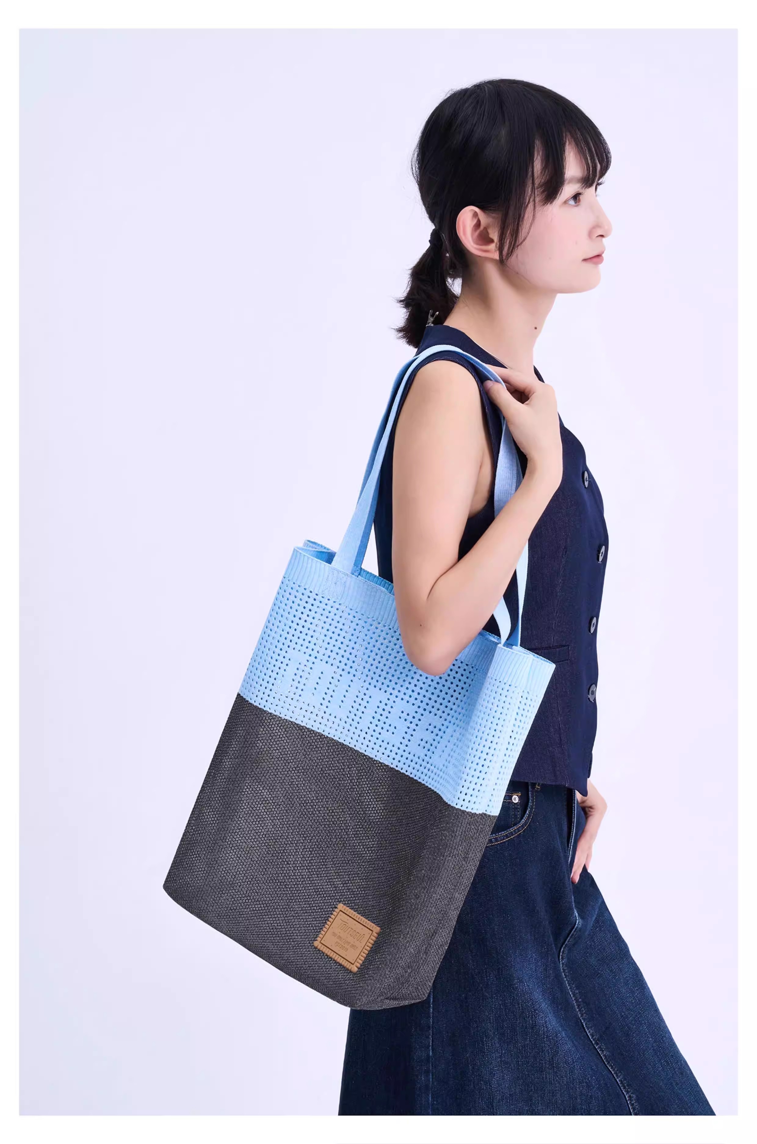We specialize in translating cutting-edge textile techniques into daily fashion. For this tote, we employ unique Hollow Out Flyknit and Custom Fancy Yarn to achieve an exceptional blend of featherlight feel, breathable visual texture, and rugged durability, setting it apart from conventional canvas or cotton totes.