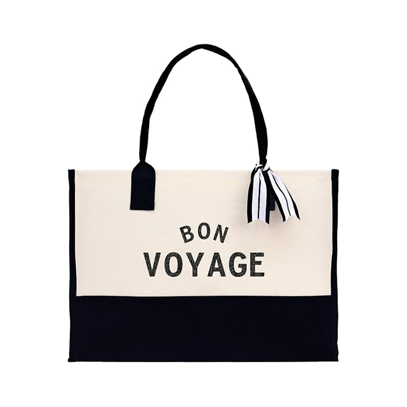 Beach Please, Escape, Getaway, Honeymoon Vibes, Lake Life, Peace Out, Road Trip, Weekend Vibes—eight moods, eight messages, one reliable tote. The black glitter print on natural canvas catches light without shouting, giving each phrase a subtle sparkle that turns a simple bag into a conversation piece.