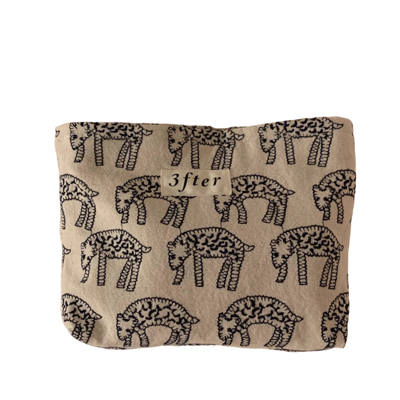 Blend art with utility in our signature cosmetic bag washable. This piece is crafted from premium 12 oz cream-colored canvas, offering a sturdy yet soft foundation. The exterior is adorned with a whimsical, repeating black line-drawn goat pattern, showcasing a delicate, embroidery style makeup pouch aesthetic through precise printing. A genuine cream leather patch bearing the "3fter" brand mark is centrally affixed to the front, adding a touch of rustic sophistication. The bag is fully lined for structure and finished with a reliable gold-toned zipper framed in black binding, ensuring both seamless function and a clean, modern silhouette.