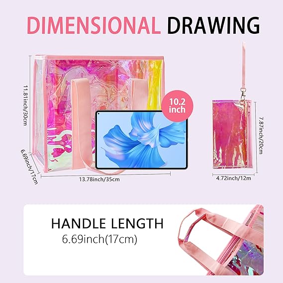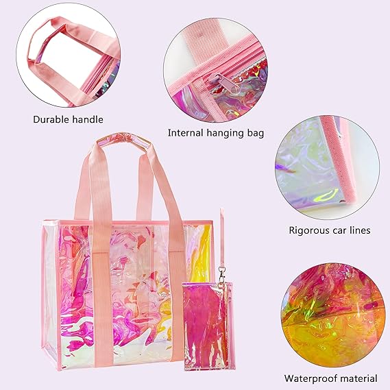Key Features | Holographic/Rainbow Finish, Waterproof PVC, Transparent, Reinforced Handles & Stitching |