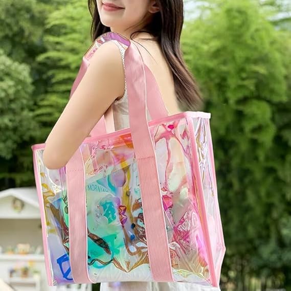 The ultimate transparent beach bag. Pack towels, sunscreen, sunglasses, and snacks. The waterproof interior handles wet swimsuits, and the holographic design ensures your bag is both easy to spot and a stylish statement.