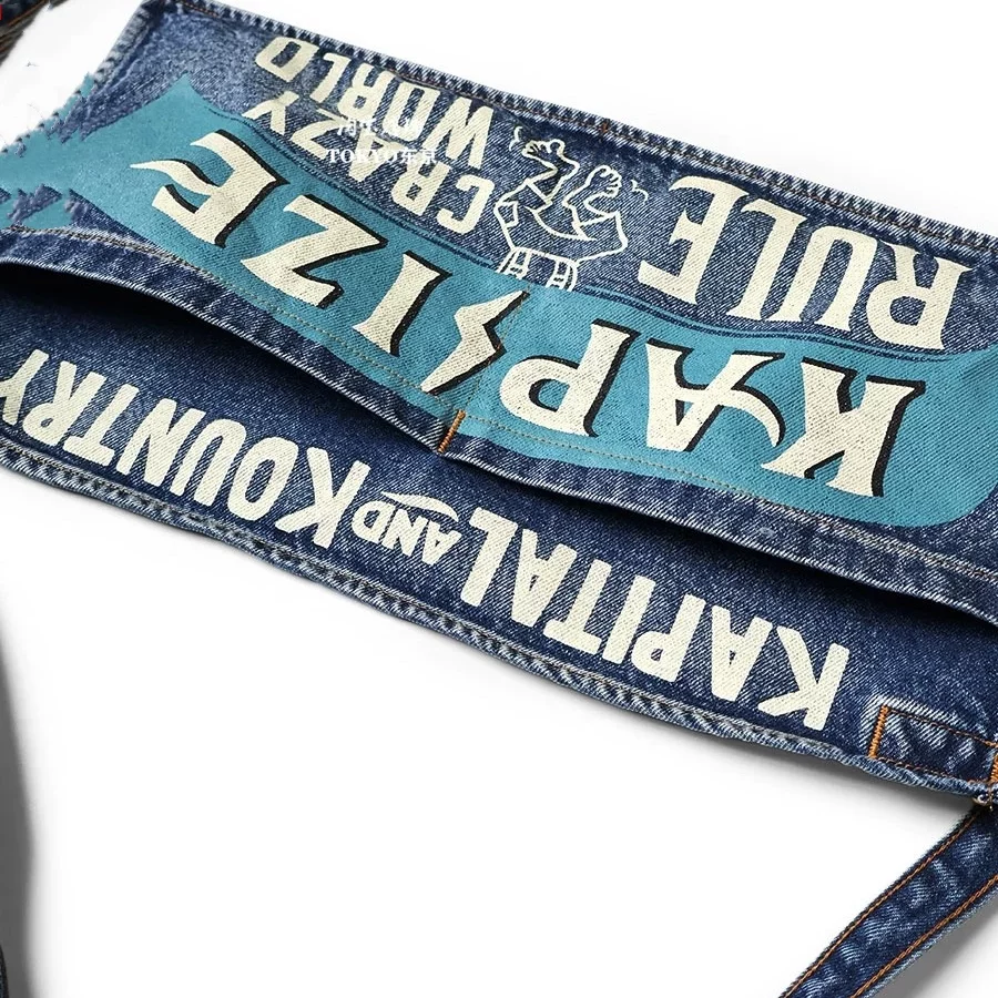 We replace the retro lettering with your brand name, your slogan, your message. Keep the denim or canvas, the four wearing styles, the metal hardware. Your identity becomes something people wear, not just carry.