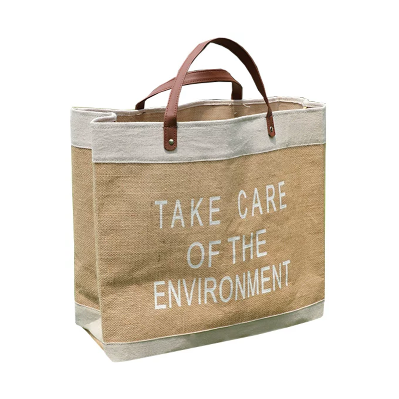 We provide a detailed quotation for this jute and leather strap tote within 24 hours of your inquiry. For urgent pricing on bulk orders with custom printing (like the environmental slogan), contact us directly for expedited service.