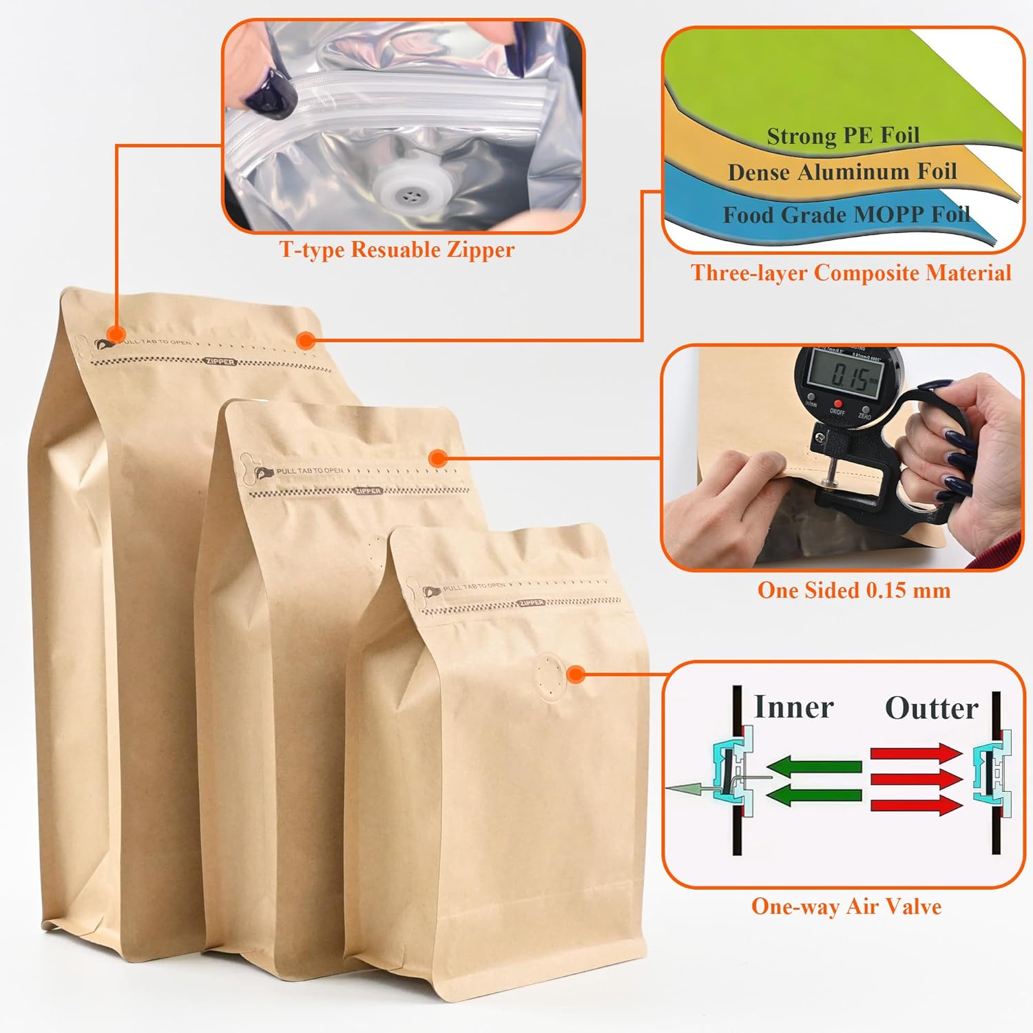 Crafted with a durable 3 layer laminate of BOPP, PET aluminum foil, and food grade PE, these stand up pouches offer excellent protection against moisture, oxygen, and external odors. The kraft paper exterior provides a natural, premium appearance suitable for coffee roasters and specialty food brands. Each bag is equipped with a one way degassing valve that allows excess carbon dioxide to escape without letting oxygen in, preserving freshness and preventing bloating.