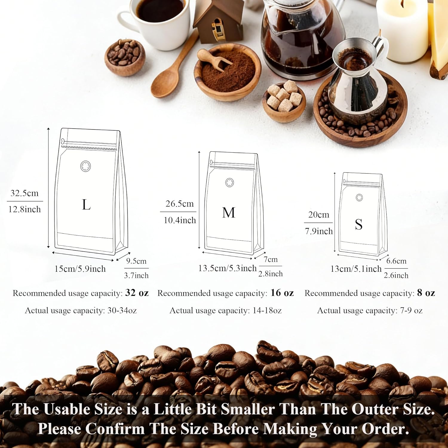 The side gusset design allows the bag to stand upright on shelves, while the resealable zipper closure enables easy opening and closing for repeated use. A convenient tear notch at the top provides tool‑free opening. For initial filling, the top can be heat sealed to ensure an airtight seal before distribution. Measuring approximately 2.8 by 5.2 by 10 inches, each bag holds 16 ounces (1 pound) of whole bean coffee or similar dry goods.