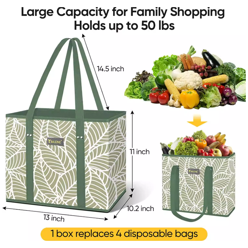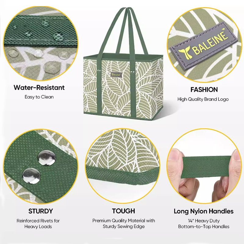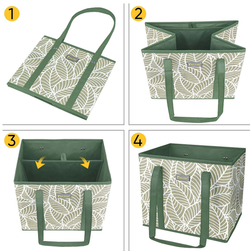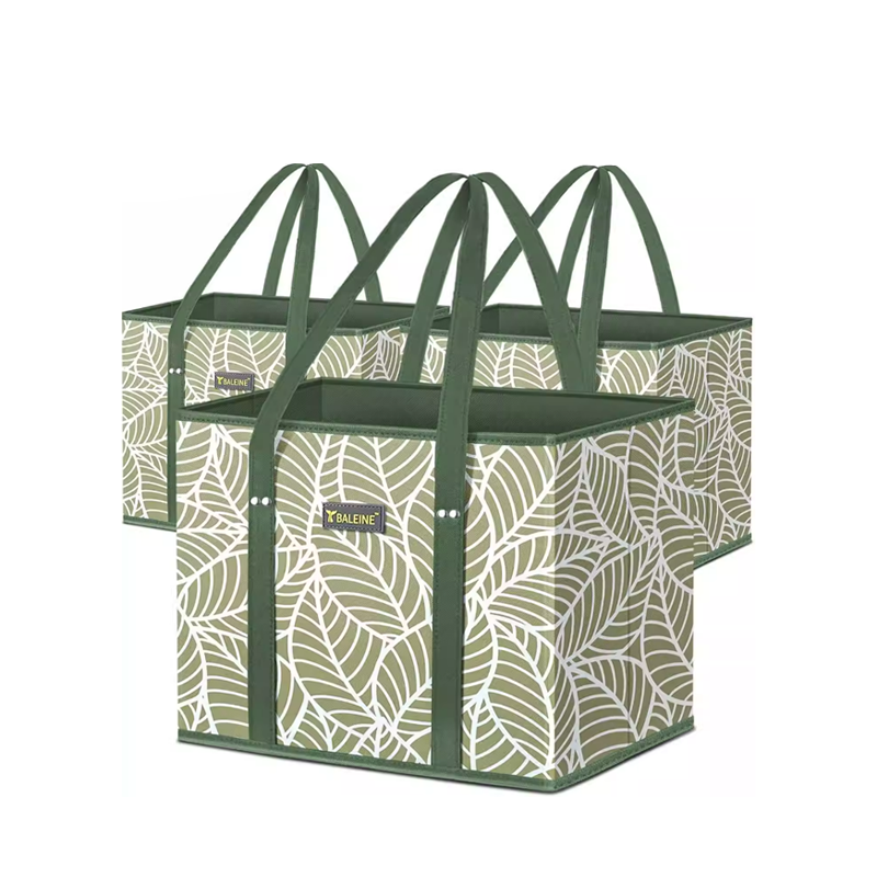An interior divider pocket allows organized separation of items, preventing clutter and making items easier to access. The fresh leaf pattern design adds aesthetic appeal suitable for outdoor and home settings. The durable construction withstands heavy loads of vegetables, fruits, groceries, picnic supplies, camping gear, beach toys, and household items. Versatile enough for family shopping, outdoor activities, beach trips, camping adventures, toy storage, and everyday organization. Fully customizable through OEM and ODM services with custom colors or patterns available for bulk orders.