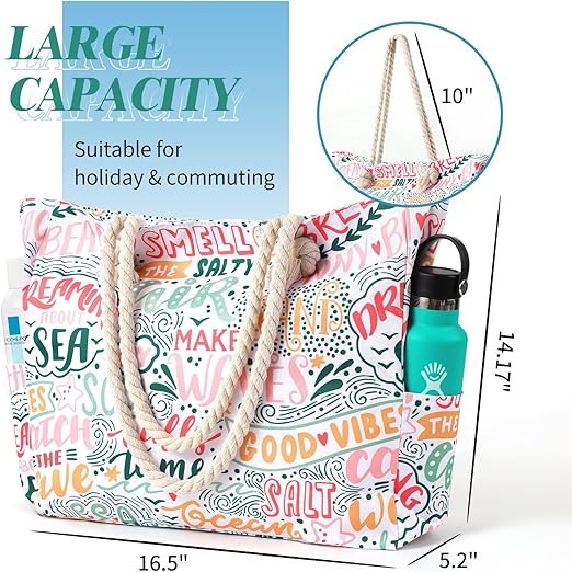 The bag measures 16.5 inches in length, 14 inches in height, and 5.2 inches in width, providing generous space for lotions, lipstick, beach towels, hats, toys, beverages, wallets, flip flops, sunglasses, sunscreen, swimsuits, and other essentials. The zipper closure ensures contents stay secure, while an inner zipper pocket offers safe storage for valuables. Two side pockets provide convenient access to water bottles, sunglasses, and frequently used items.
