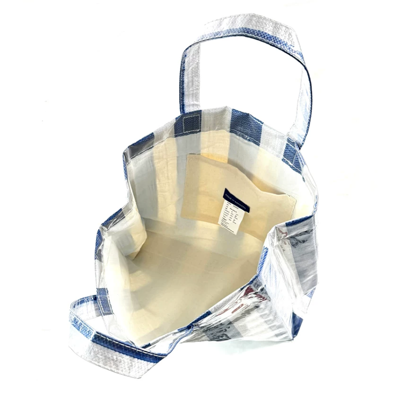 Embrace a timeless union of function and style with the Navy Blue Stripe PVC Woven Tote. This bag captures the essence of retro utility with its iconic, bold blue and white wide-stripe pattern, now rendered in a modern, highly durable form. The exterior is crafted from a tightly woven base material sealed with a clear PVC coating, creating a surface that is waterproof, stain-resistant, and incredibly easy to clean—ideal for unpredictable weather and daily wear. The interior is thoughtfully lined with soft, natural cream-colored cotton fabric, protecting your belongings and adding a layer of refined comfort rarely found in reusable totes.