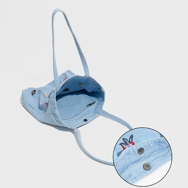 A magnetic snap closure provides quick access while securing contents. Inside, a spacious main compartment accommodates a 10.9 inch tablet, phone, power bank, and cosmetics, while a zippered pocket and slip pocket organize smaller items. The shoulder straps, made of matching denim, have a 29 centimeter drop for comfortable hand or shoulder carry, reinforced with secure stitching for reliable load bearing. Fully customizable through OEM and ODM services, this bag supports custom embroidery or printed logos for brand promotions or gift giving.