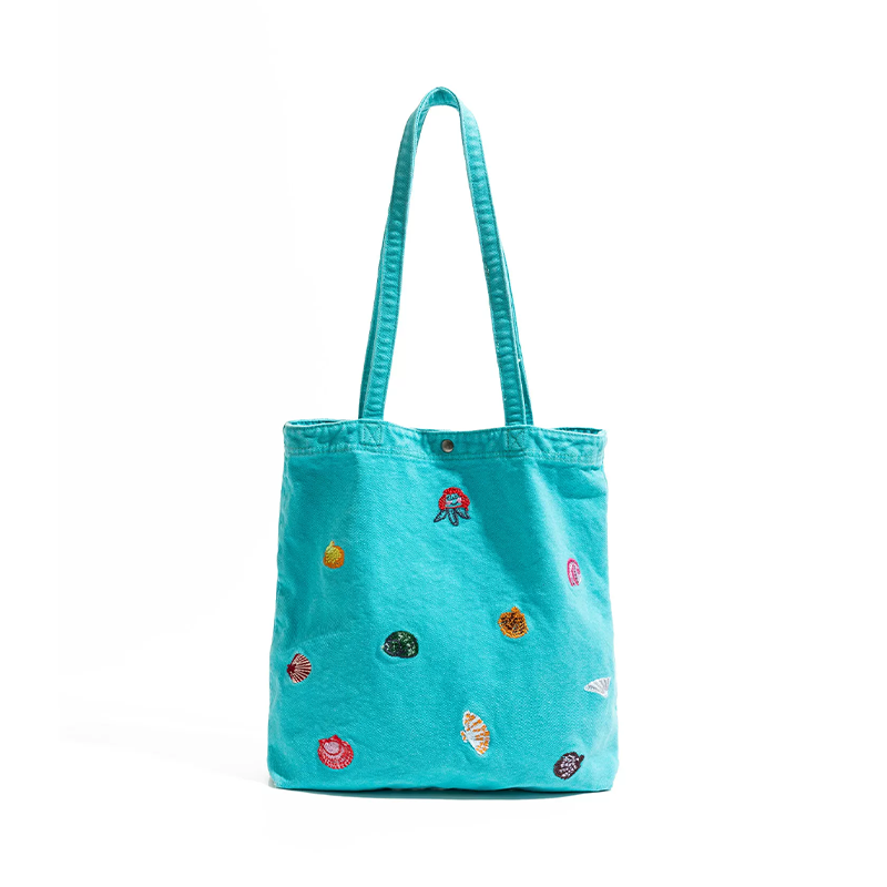 Crafted from washed denim canvas, this bag offers a soft yet structured feel with excellent durability and breathability. The fabric resists pilling and wear while maintaining its shape through daily use. Four fresh color options allow personal expression: light blue for a crisp look, mint green for energetic style, black for edgy appeal, and lavender for gentle elegance. The exterior features dimensional shell and coral embroidery with rich colors and fine stitching, creating a soothing ocean aesthetic that balances casual comfort with refined detail.