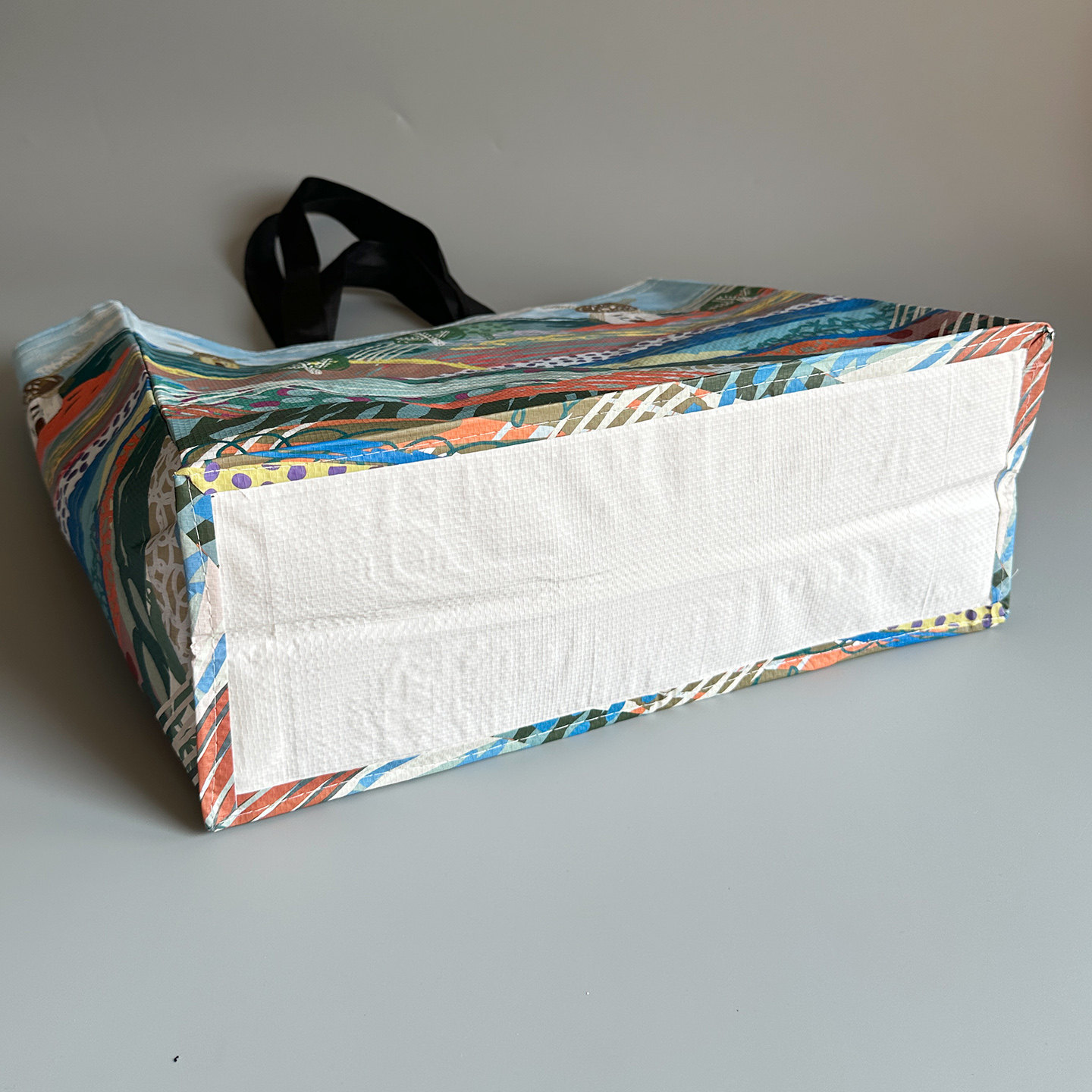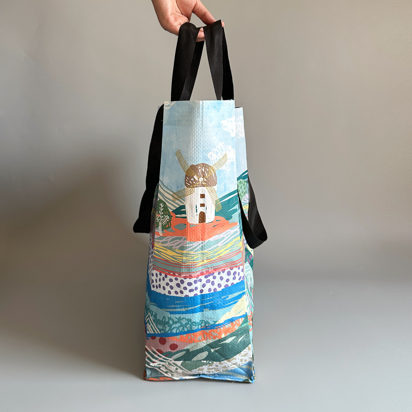 The exterior showcases a vibrant artistic pastoral landscape featuring colorful windmills, trees, rolling terrain, and blue skies. The whimsical brushstrokes and bright colors evoke a sense of freedom and tranquility, transforming the bag into a portable piece of art. The same design prints on both sides, ensuring visual consistency from every angle. The spacious 43 by 43 by 17 centimeter interior accommodates groceries, beach essentials, moving supplies, and large household items with ease. Fully customizable through OEM and ODM services, this bag supports replacement of the landscape print with brand logos, custom patterns, or event themes using screen printing or UV digital techniques.