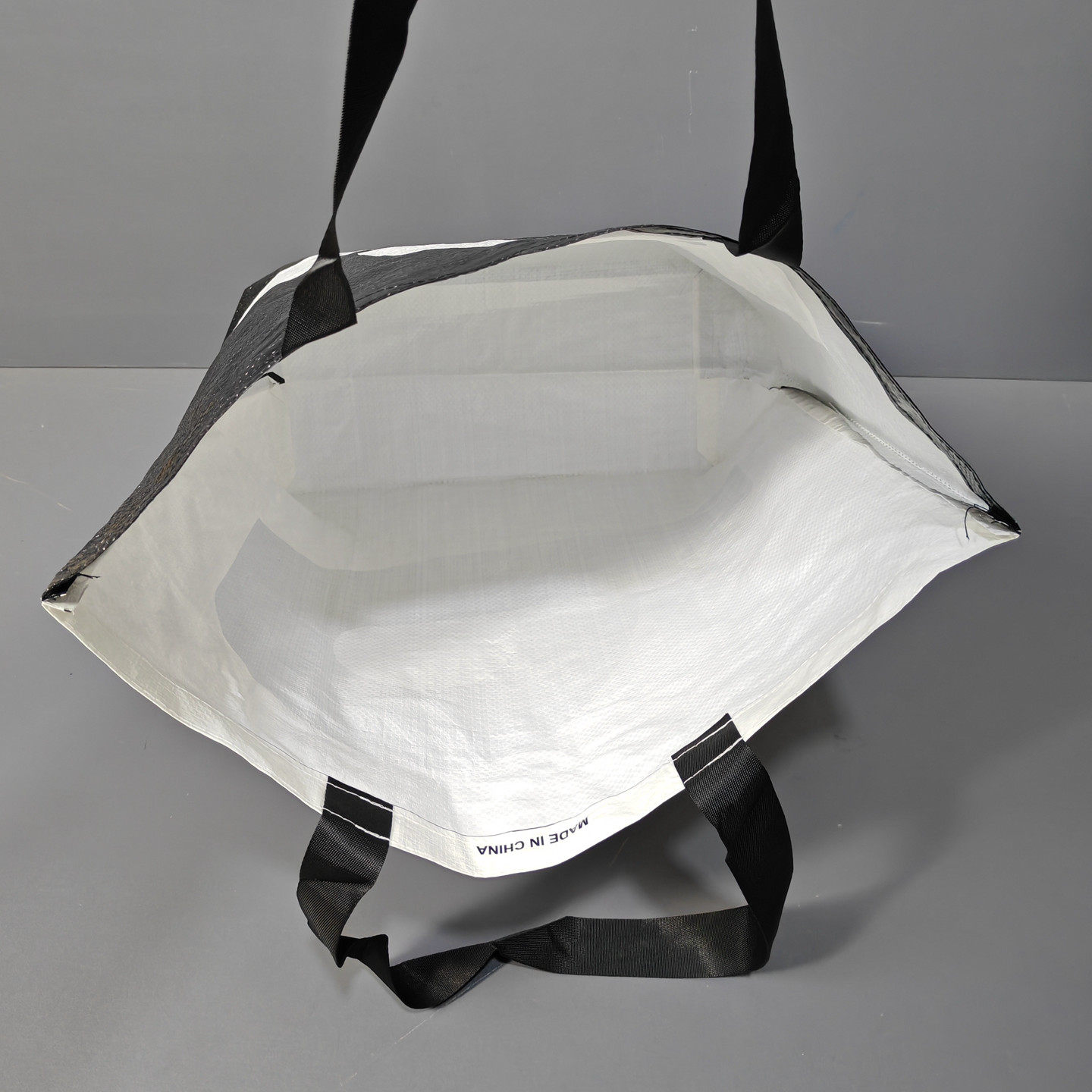 Crafted from waterproof laminated woven fabric, this bag offers excellent water resistance and stain protection while maintaining a durable thick woven texture that resists tearing even under heavy loads. The material can be easily wiped clean with a damp cloth, ensuring long-lasting freshness through repeated use. Black woven straps are securely stitched with reinforced stitching for strong load-bearing capacity, and can be used for hand carrying or worn over one shoulder. A white waterproof lining adds an extra layer of protection and easy maintenance.