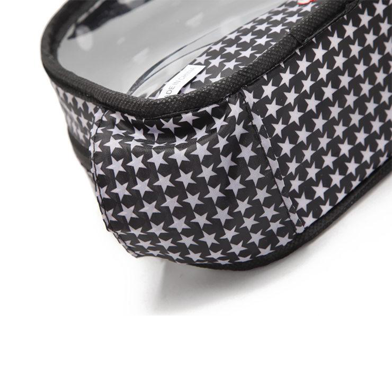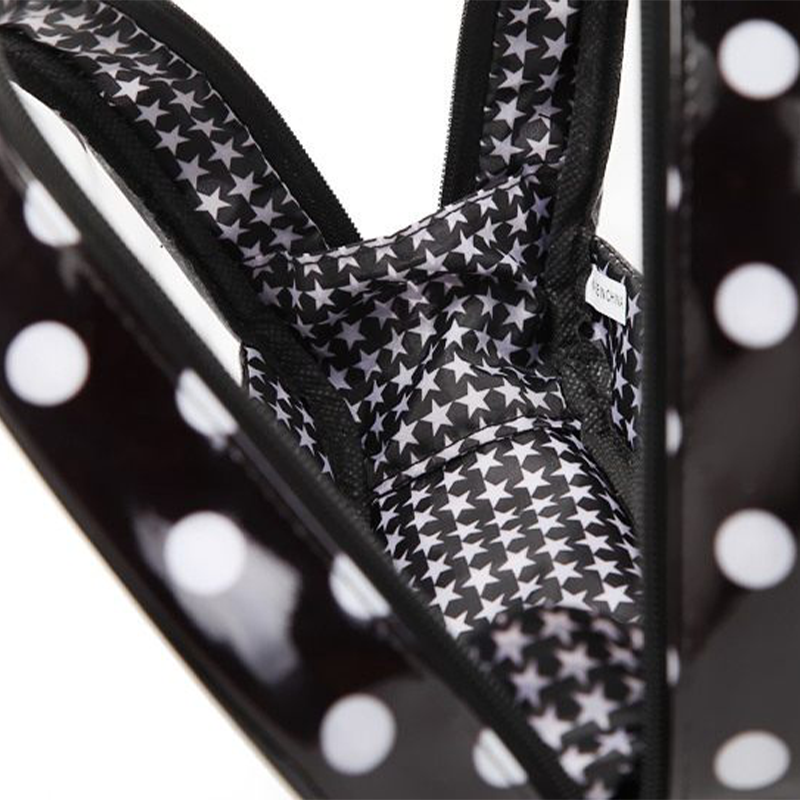 Crafted from glossy laminated PVC material, this bag provides excellent water resistance and easy cleaning while maintaining durable shape retention. The transparent front window allows instant visibility of contents, eliminating the need to search through items. Double edge binding and precision stitching ensure reliable construction. A smooth zipper with black pull tab enables effortless opening and closing. The interior features black and white star print fabric that complements the outer polka dot design.