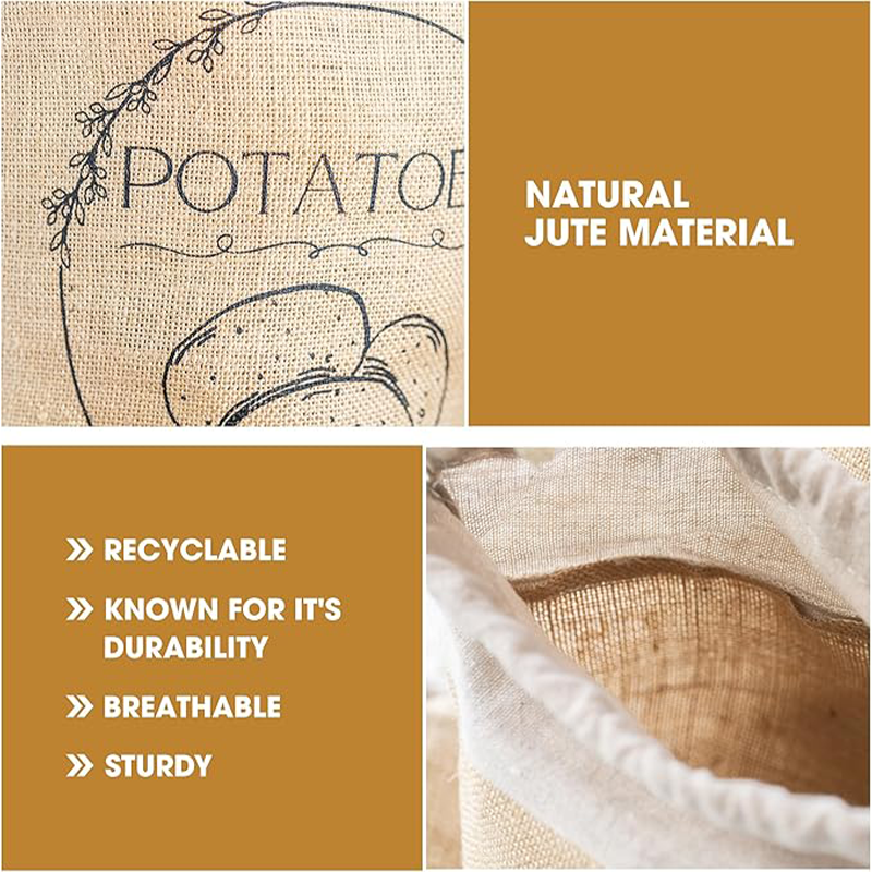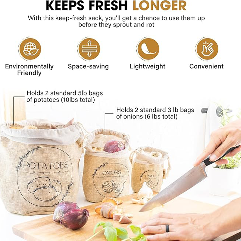 Crafted from premium natural jute + cotton lining, this 3-piece Potato Onion Garlic Keeper Bags Set keeps root vegetables fresh 3–5× longer with perfect breathable airflow and light-blocking design. Large potato storage bag holds 10 lbs, medium onion keeper holds 6 lbs, small garlic sack keeps heads perfectly ventilated. Rustic farmhouse print, sturdy drawstring closure, and fully washable—ideal for pantry organization, farmers market runs, or eco-friendly bulk buying while adding charming kitchen decor.
