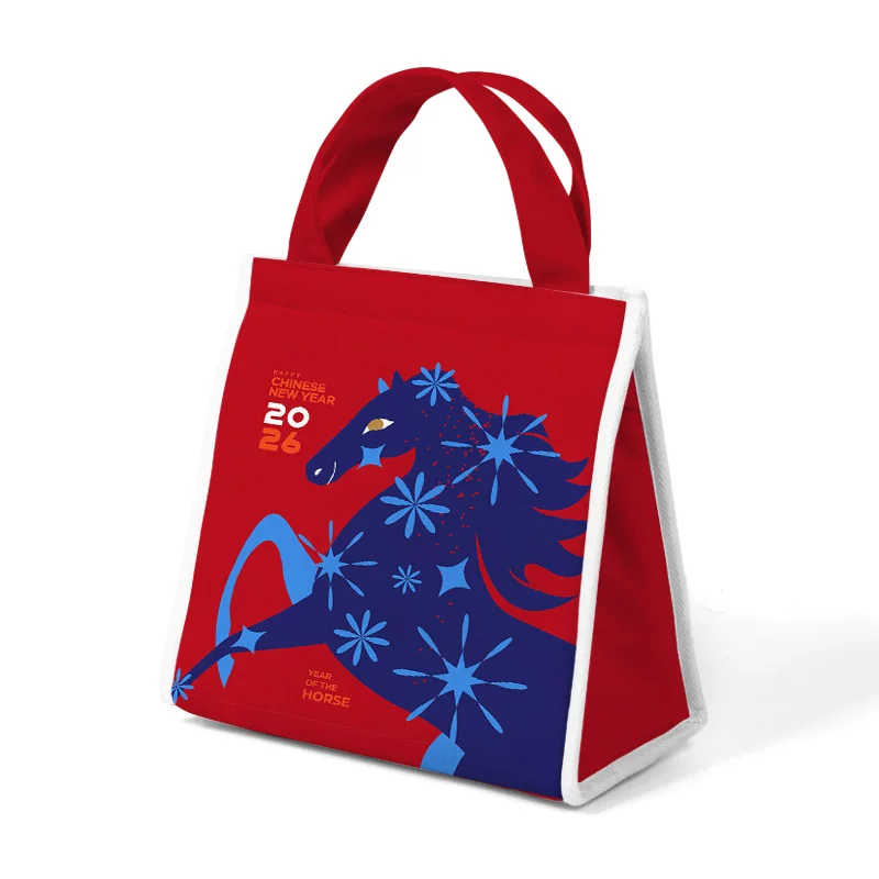 Celebrate with purpose and practicality using the Red Horse Print Insulated Gift and Lunch Tote Bag. This distinctive zodiac horse merchandise combines cultural artistry with functional design, featuring a vibrant red base adorned with a deep blue horse and snowflake motif, accented with "2026" for commemorative appeal. Crafted from a premium high-density short fleece cotton-linen blend, the exterior offers a soft, tactile, and breathable feel, while the interior is lined with a waterproof and insulated aluminum foil layer to protect contents from temperature changes and spills. Thoughtful details include a secure Velcro flap closure at the top for easy access and safety, and comfortable handles tailored to the bag's compact 22x22x12cm dimensions, making it as suitable for carrying a heartfelt gift as it is for a personal lunch.