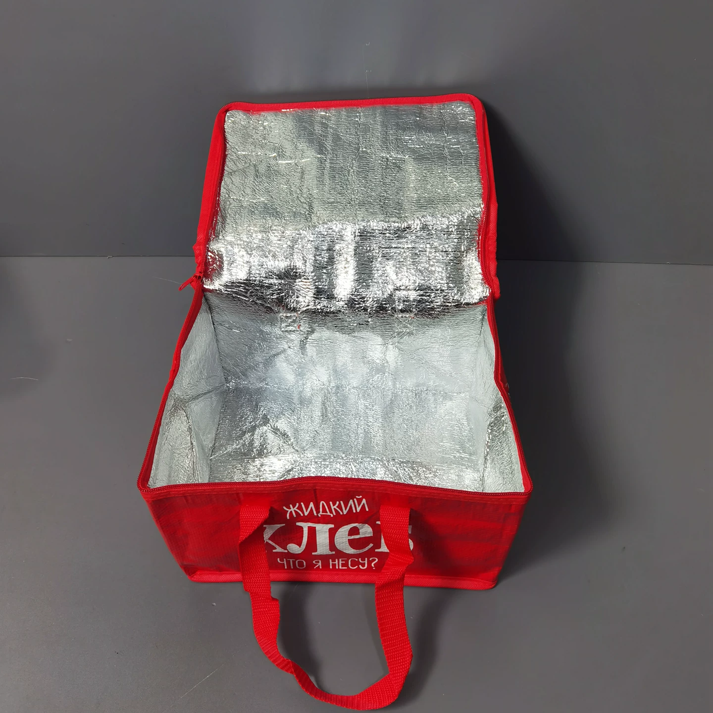 Introducing the Laminated Woven Insulated Thermal Tote Bag, a versatile and rugged carrier engineered for food freshness and reliable transport. The exterior is crafted from red laminated polypropylene (PP) woven fabric, offering exceptional resistance to water, oil, and tearing. The smooth laminated surface is easy to wipe clean, making it ideal for frequent use in food handling environments. Inside, a aluminum foil composite pearl cotton lining provides effective thermal insulation, reflecting heat to maintain food temperature—whether keeping hot dishes warm or preserving chilled groceries during transit.