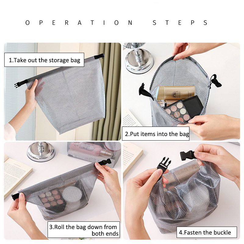 Place your wet swimsuit on the mesh. Add your shampoo, your towel, your shower sandals. Then roll—once, twice, three times—until the bundle is tight. Buckle the sides. Done. What was flat becomes compact. What was messy becomes organized. The bag works while you move on to your next thing.