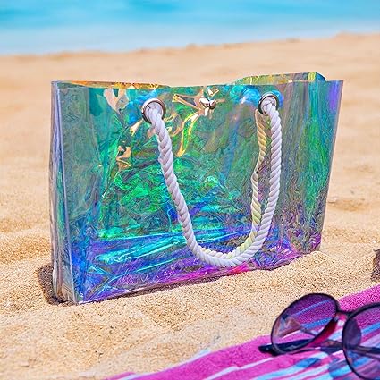 Crafted from high quality clear PVC with a holographic iridescent finish, this tote creates a mesmerizing rainbow shimmer that changes with light and viewing angle. The material is water resistant, protecting contents from splashes while remaining lightweight and easy to wipe clean. Durable twisted rope handles provide comfortable carrying and add a nautical touch to the beach ready design. The wide opening allows quick access to belongings, and the large capacity easily holds towels, sunscreen, sunglasses, snacks, and other summer essentials.