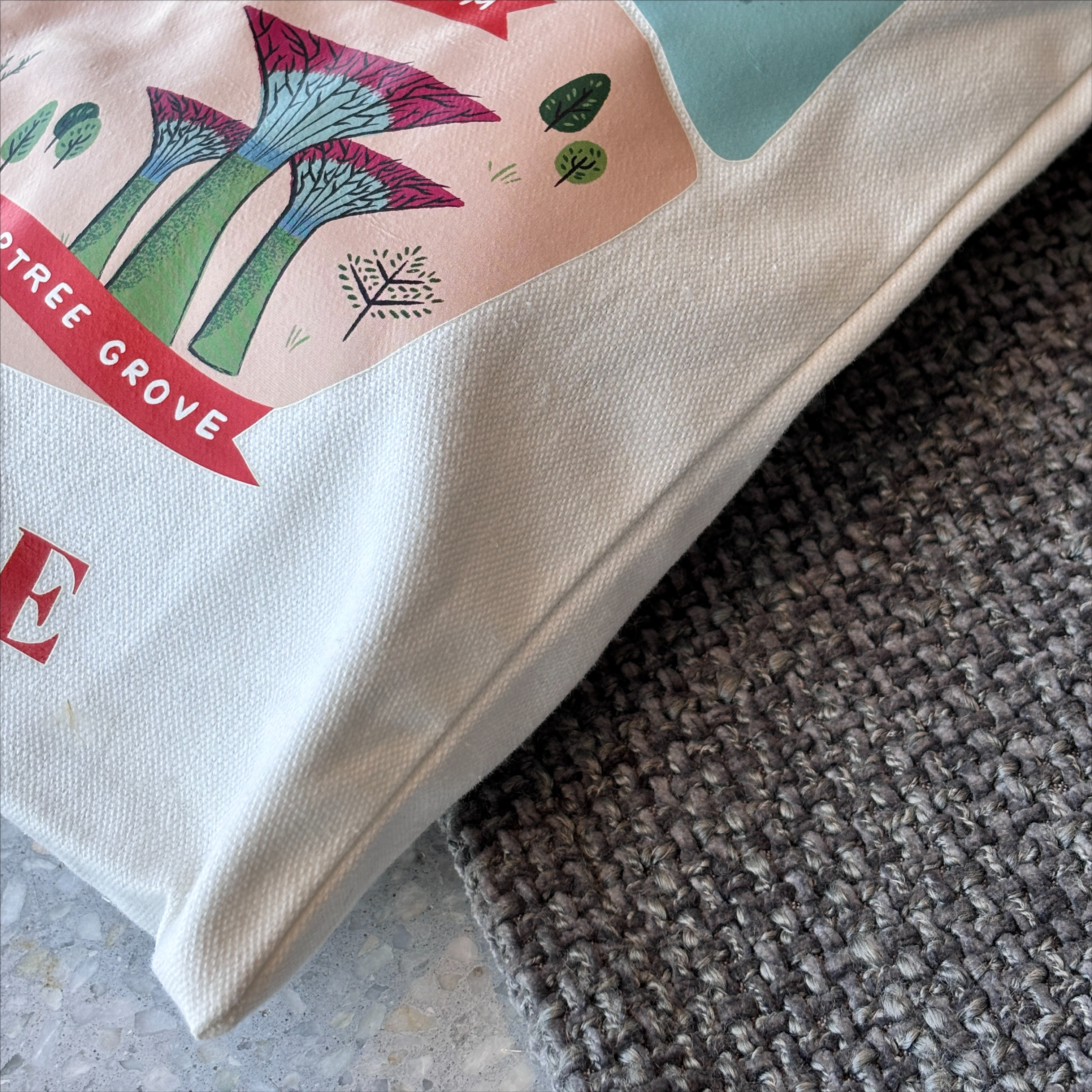 Merlion spraying water. Marina Bay Sands curving against the sky. Supertrees reaching upward. The Singapore Flyer turning. ArtScience Museum blooming like a lotus. Five icons, one bag, rendered in soft colors that feel like watercolor memories rather than postcard clichés.