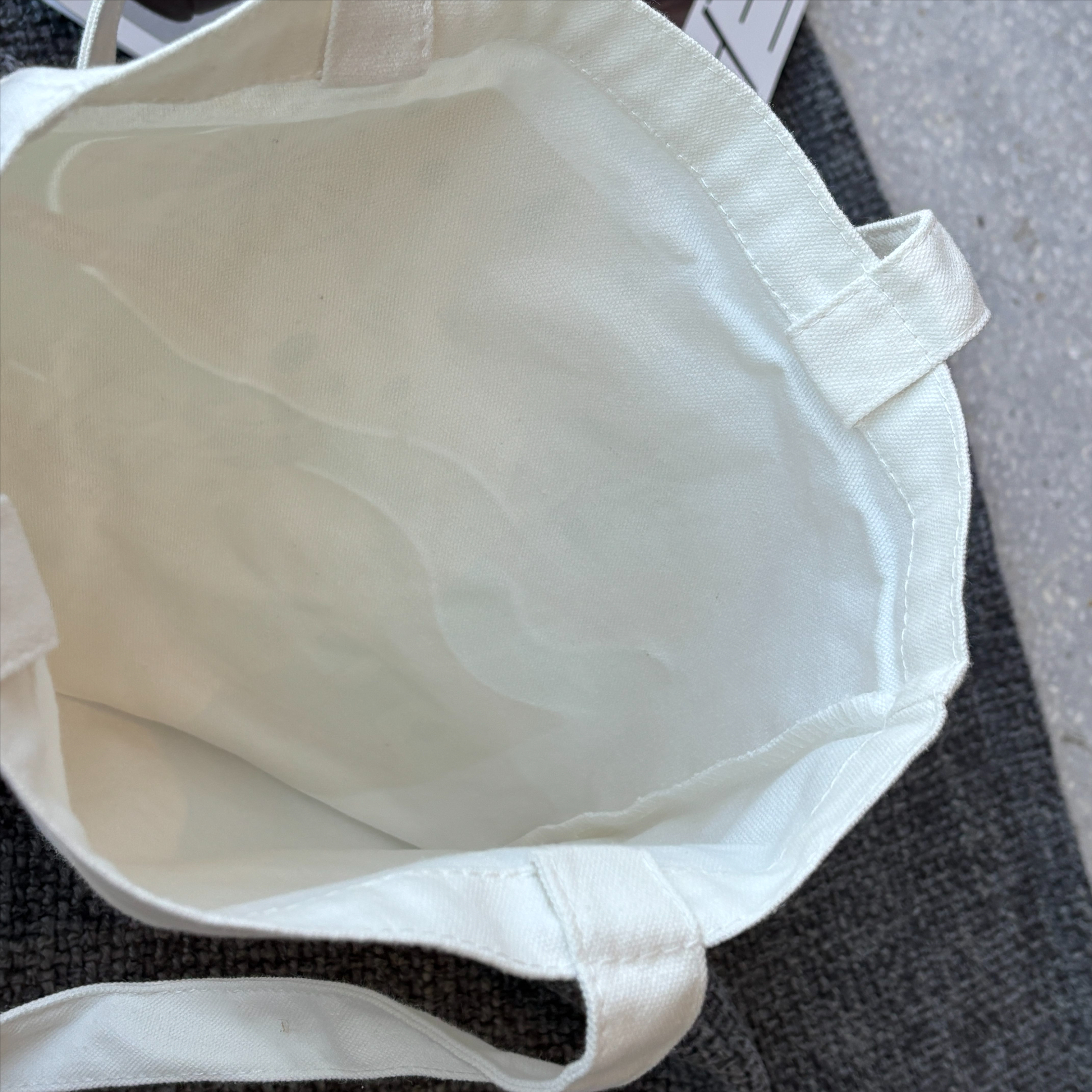 Use it for supermarket visits, farmers market trips, or casual shopping. The white base pairs easily with any outfit, and the spacious interior handles groceries, personal items, and purchases. The durable canvas withstands regular use while the artwork adds personality to routine errands.