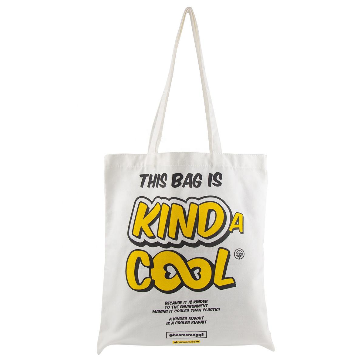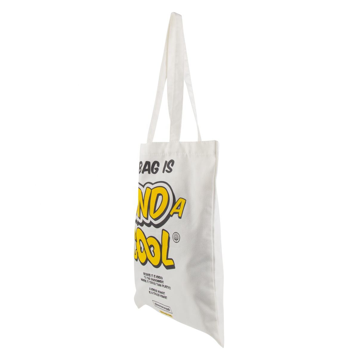 Declare your style and values with our standout recycled material slogan tote bag This isn't just a bag it's a wearable statement crafted for those who blend environmental consciousness with urban cool Constructed from premium thick and sturdy cotton canvas made from recycled materials it offers a superior substantial feel and long lasting durability that far exceeds flimsy alternatives The entire design centers on the bold playful slogan THIS BAG IS KINDA COOL rendered in a dynamic yellow and black color block with a 3D outline effect that pops against the neutral cream background.