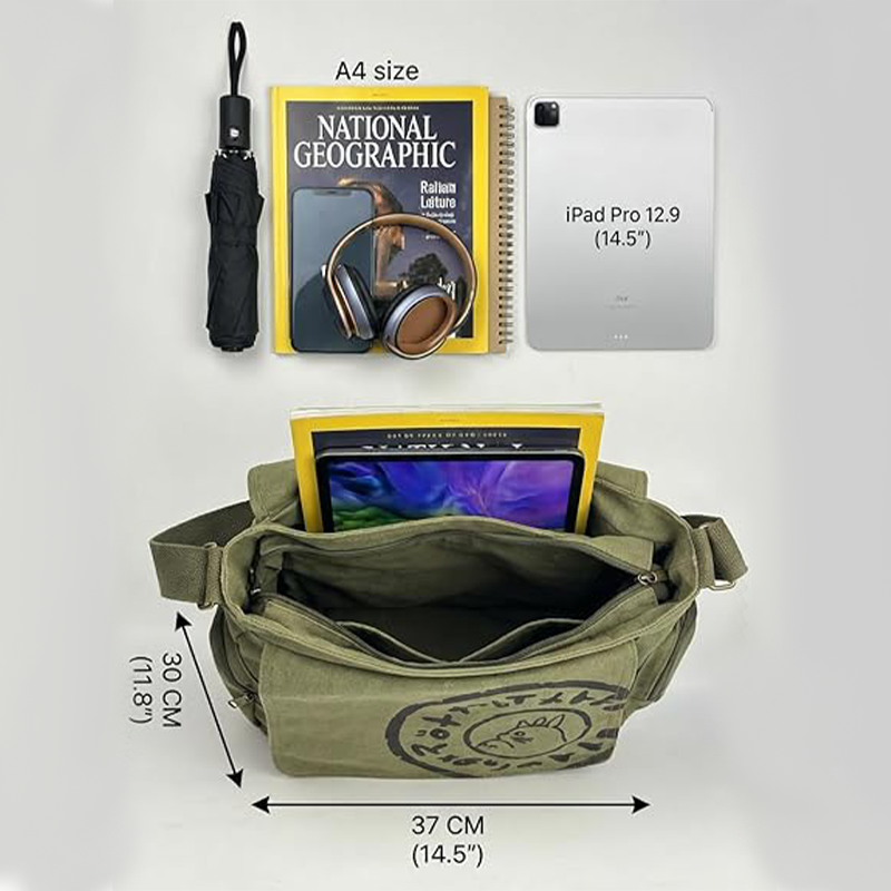 The spacious main compartment measures 16.54 inches in length, 14.57 inches in height, and 4.8 inches in width, accommodating A4 documents, 12.9 inch iPads, books, umbrellas, and daily essentials. An adjustable canvas shoulder strap with antique brass metal hardware allows comfortable crossbody or single shoulder carry. Clean edge stitching and smooth metal zippers ensure reliable performance through frequent use.