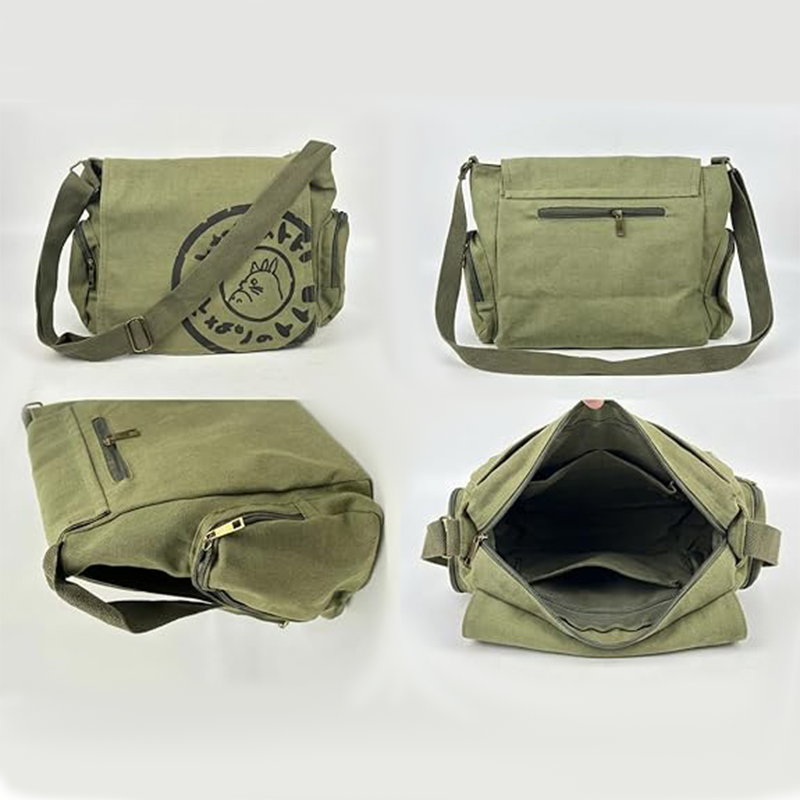 The dual closure system combines a flip cover with a secure zipper, offering both quick access and reliable protection for belongings. The front features an authentic My Neighbor Totoro cartoon print within a Japanese stamp style border, adding a nostalgic anime touch without overwhelming the bag's classic silhouette. Two side zipper pockets provide organized storage for phones, keys, and small essentials.