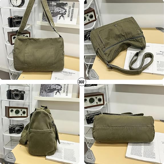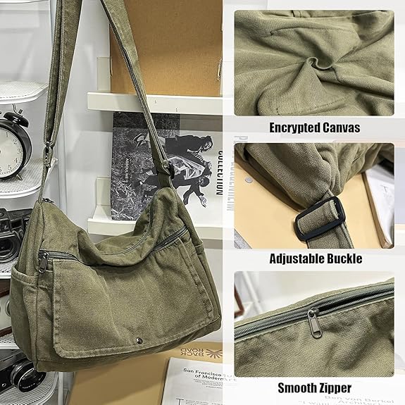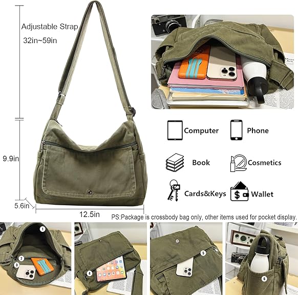 The adjustable shoulder strap ranges from 32 to 59 inches with a width of 1.77 inches, allowing comfortable crossbody or shoulder wear for various heights while reducing pressure on shoulders. Available in multiple colors including olive green, khaki, black, purple, and light gray, this vintage style bag suits unisex use for dating, work, college, shopping, travel, and daily activities. The simple casual design allows personalization with badges, pins, or embroidery. An excellent gift choice for mothers, daughters, girlfriends, and friends on birthdays, Valentine's Day, Mother's Day, Thanksgiving, Christmas, and anniversaries. Fully customizable through OEM and ODM services with custom colors or logo printing available for bulk orders.