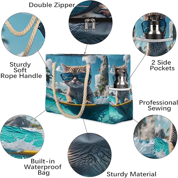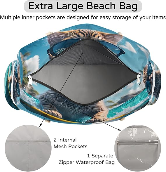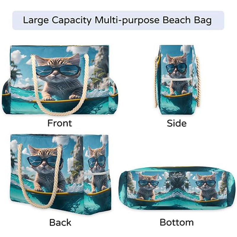 Crafted from high quality durable and washable polyester fabric, this beach tote offers excellent waterproof and sandproof protection while remaining lightweight and foldable for convenient storage. The double zipper closure ensures secure closure, while sturdy knotted rope handles are professionally sewn for comfortable carrying. The fabric is easy to clean and maintains its appearance through repeated use.
