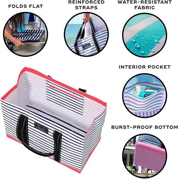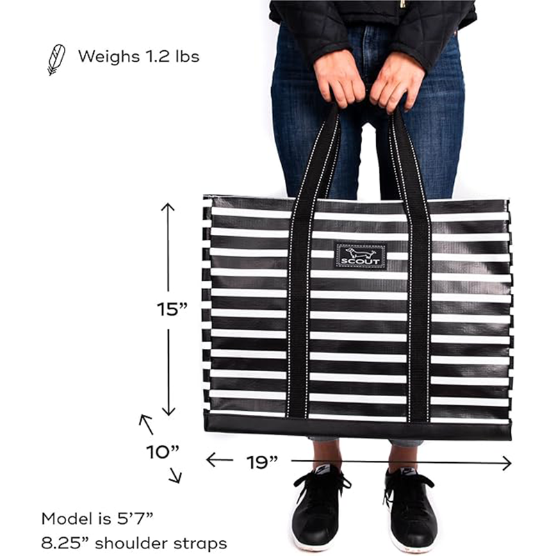 Waterproof non-woven with a laminated finish—juice from the bottom of the bag, condensation from frozen foods, wet swimsuits after the beach. All of it wipes away. The stripes stay bright, the bag stays clean, and your car stays dry.