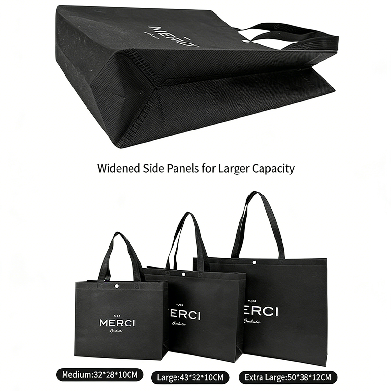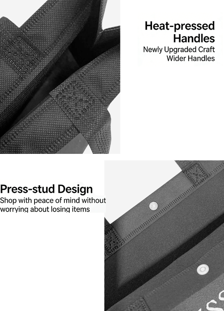 Diese aus strapazierfähigem Vliesstoff gefertigte Taschenserie kombiniert leichte Tragbarkeit mit erheblicher Tragfähigkeit – sie trägt 15–20 Kilogramm und wiegt nur 90 Gramm. Drei Größenoptionen decken unterschiedliche Anforderungen ab: „Medium“ passt für einen schweren Pullover und eine leichte Jacke, „Large“ bietet Platz für ein Set aus Pullover und Kapuzenpullover und „Extra Large“ bietet Platz für Jacken oder Schuhkartons. Verbesserte hitzeversiegelte Griffe beseitigen Nahtprobleme und sorgen für einen reibungslosen, bequemen Halt und zuverlässige Festigkeit. Metalldruckknöpfe sichern den Inhalt während des Transports, während die erweiterten Seitenfalten und die flache Bodenkonstruktion auch bei voller Beladung ihre Form behalten. Hochauflösender Druck mit importierter Tinte sorgt für scharfe Logos und lebendige Farben ohne Ausbleichen.