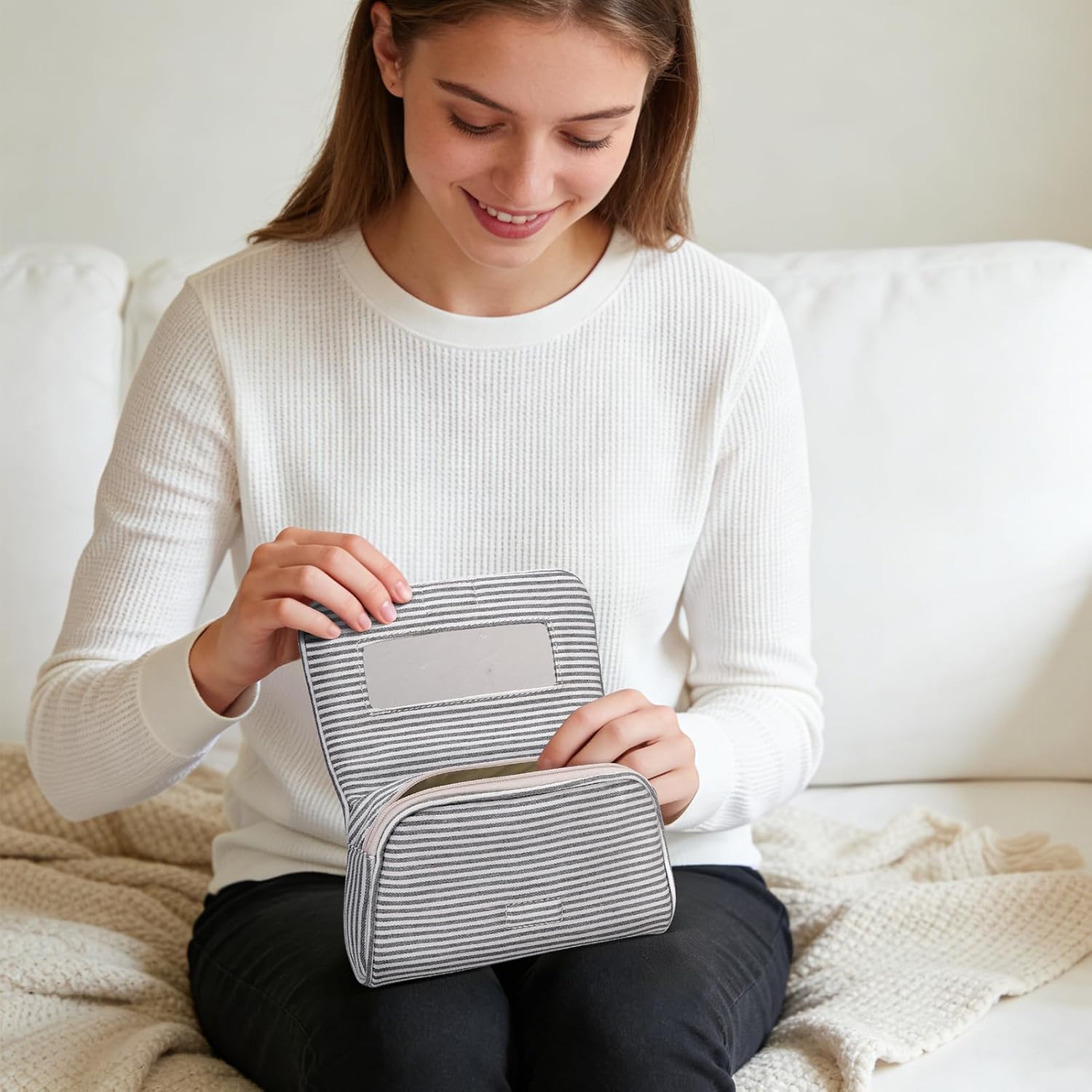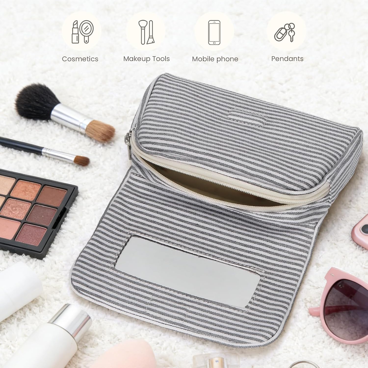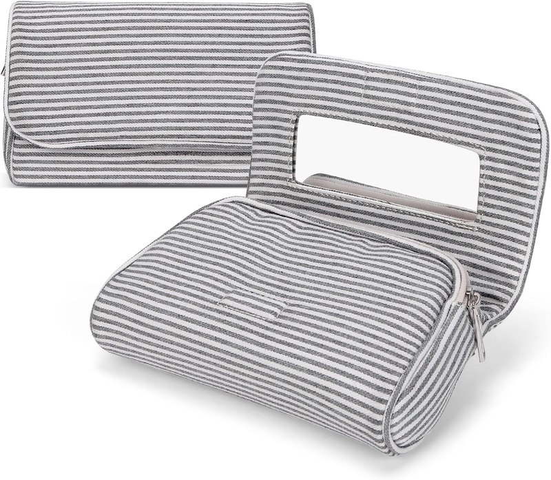 Verwenden Sie es zu Hause für das tägliche Make-up. Packen Sie es für einen Wochenendausflug ein. Schenken Sie es einem Freund, der Streifen, Tupfen oder einfach den Komfort eines eingebauten Spiegels liebt. Eine Tasche, alle Momente, in denen Sie ein wenig Organisation mit viel Charme brauchen.