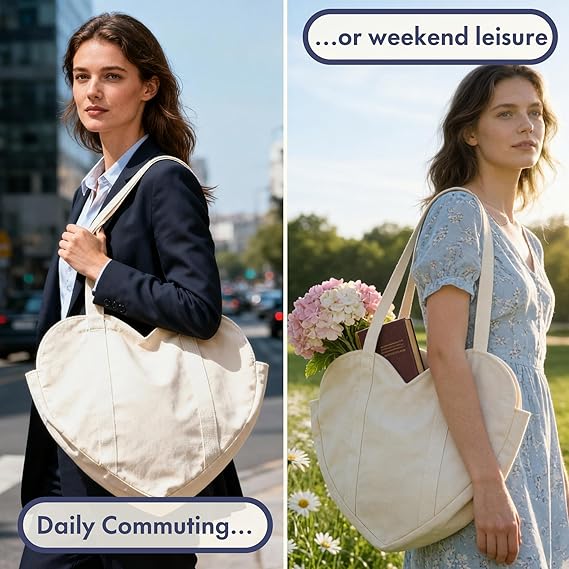 Für Bibliotheksbesuche, Stöbern in Buchhandlungen, Bauernmarktbesuche oder gelegentliche Einkaufstouren. Das Herzdesign verleiht den täglichen Aktivitäten Charme und die leichte Konstruktion sorgt für ein angenehmes Tragegefühl.