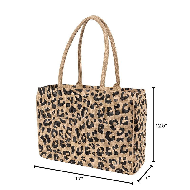 Diese Einkaufstasche aus Jutemarkt verfügt über ein stilvolles Leopardenmuster auf einer robusten Konstruktion aus 100 % Jute mit wasserabweisender, beschichteter Innenseite. Mit einer Höhe von 12,5 Zoll, einer Breite von 17 Zoll und einer Tiefe von 7 Zoll und abgerundeten Griffen mit einer Tiefe von 8 Zoll bietet er großzügigen Stauraum für Lebensmitteleinkäufe, Strandausflüge und den täglichen Gebrauch. Ein verstärkter Boden sorgt für Stabilität und Stabilität, während eine Innentasche mit Reißverschluss Schlüssel, Geld oder Ausweise sicher verstaut.