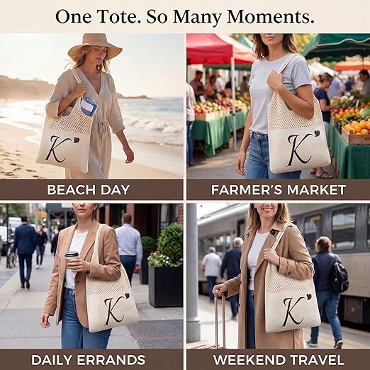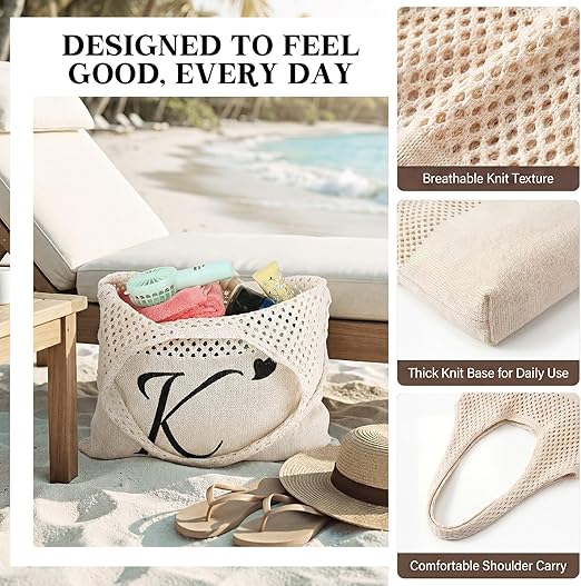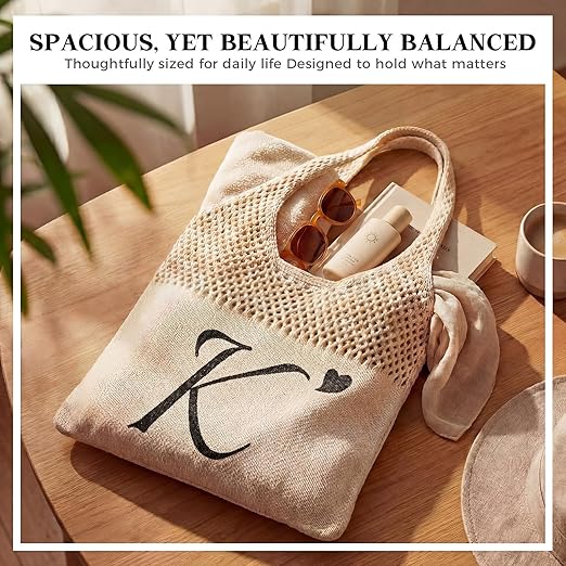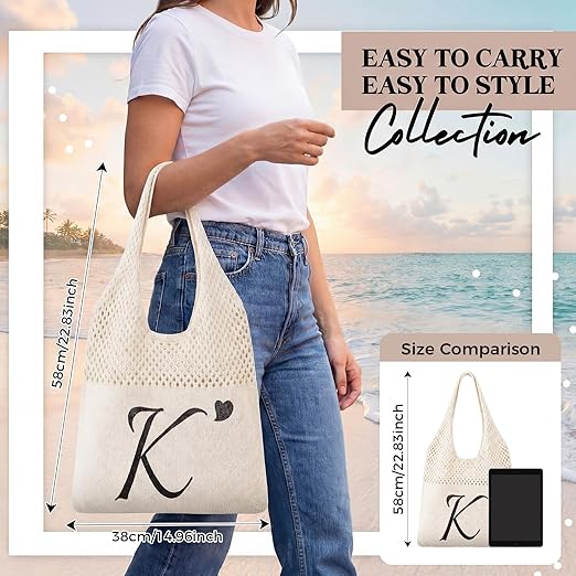 Diese aus hochwertigem Polyester gefertigte Tragetasche aus Häkelnetz bietet eine weiche, atmungsaktive Textur und eine lange Haltbarkeit. Das beige Strickdesign sorgt für eine neutrale Boho-Ästhetik, die zu jedem Outfit passt. Die Tasche verfügt über eine offene Oberseite mit einem geräumigen Innenraum und bietet problemlos Platz für Handtücher, Snacks, Wasserflaschen, Sonnenbrillen, Spielzeug, Bücher und andere Dinge des täglichen Bedarfs oder des Strandes. Ein spezieller Bereich ermöglicht die Platzierung einer personalisierten Initiale (z. B. „K“) und macht es so zu einem einzigartigen, individuellen Geschenk.