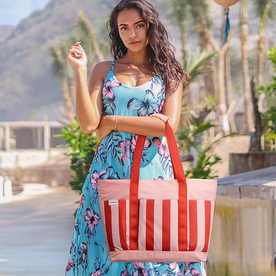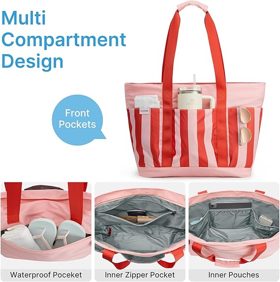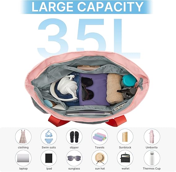 Diese aus strapazierfähigem Nylon mit Polyesterfutter gefertigte Strandtasche ist sowohl wasserdicht als auch sanddicht und schützt den Inhalt vor Feuchtigkeit und Sand. Der geräumige 35-Liter-Innenraum bietet problemlos Platz für Kleidung, Badebekleidung, Handtücher und Sonnenschutzartikel. Drei Vordertaschen bieten Platz für einen Stanley-Cup und sorgen dafür, dass Getränke immer griffbereit sind. Im Inneren sorgen mehrere Steckfächer, eine Reißverschlusstasche und eine spezielle wasserdichte Tasche dafür, dass kleine Wertsachen organisiert und trocken bleiben. Die Tasche lässt sich flach zusammenfalten und lässt sich so kompakt verstauen, wenn sie nicht verwendet wird. Glatte Reißverschlüsse und bequeme Griffe sorgen für einfaches Tragen, und ein angebrachter Flaschenöffner sorgt für Strandkomfort. Für zusätzlichen Stauraum ist eine tragbare kleine Tasche (11,8 x 9,1 Zoll) im Lieferumfang enthalten. Perfekt für Wochenendausflüge, Familienausflüge, Roadtrips und Strandpartys.