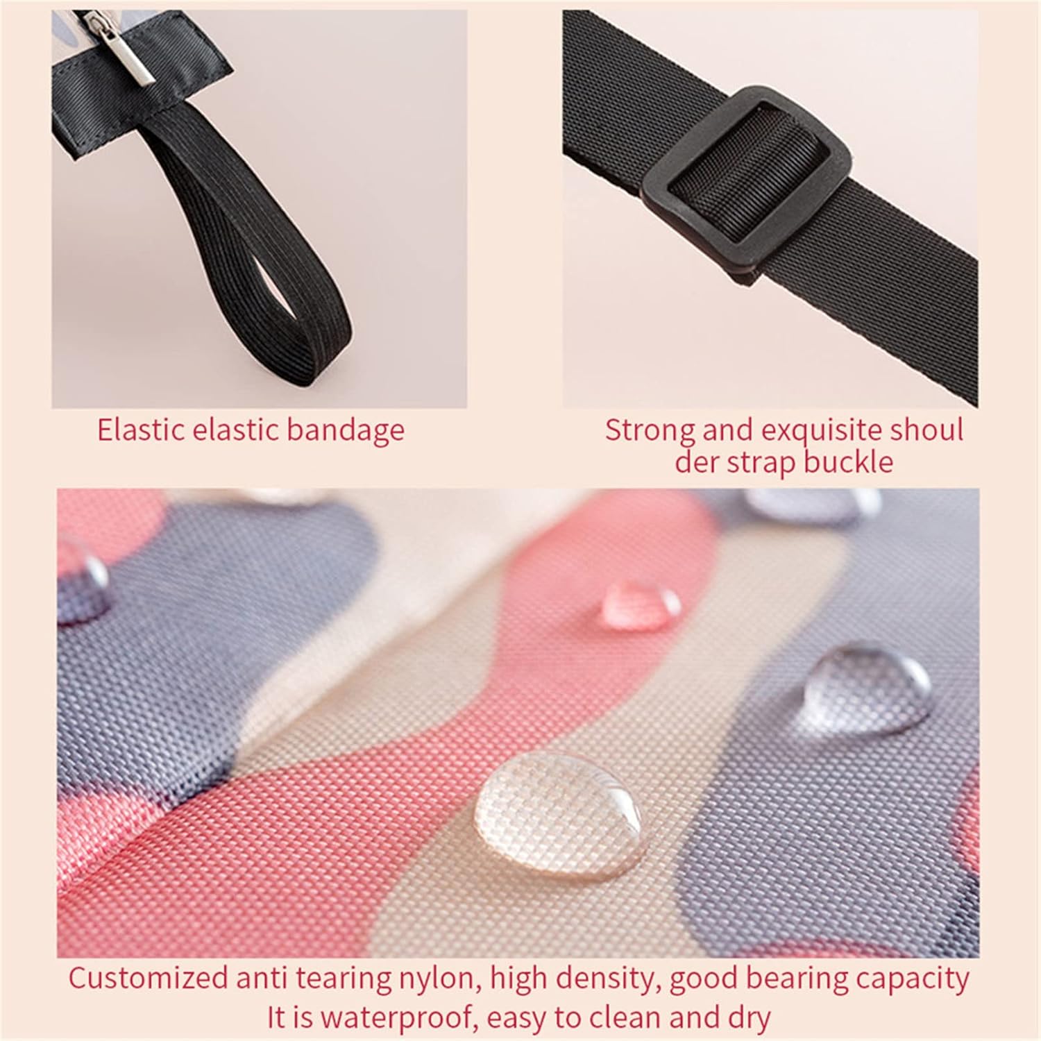 Fabricada con nailon antidesgarro de alta densidad, esta bolsa reutilizable es liviana, duradera y tratada para resistencia al agua. Se seca rápidamente y es fácil de limpiar. La tela es respetuosa con el medio ambiente, inofensiva y sin olores, lo que brinda seguridad para la compra de alimentos.