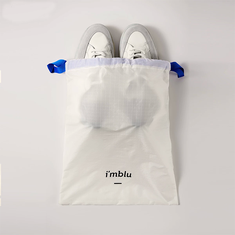 この軽量の半透明ナイロン製巾着バッグ コレクションは、旅行者、主催者、そしてシンプルさと機能性を重視する人向けにデザインされています。超軽量の乳白色のナイロン生地で作られた各バッグは、持ち運びしてもほとんど目立ちませんが、クリーンでミニマリストな外観を維持しながら、中身をさりげなく見せる柔らかな半透明効果を提供します。この生地は、精密な縦糸と横糸を使用して素材に直接織り込まれた細かい格子模様を特徴としており、印刷やコーティングは行われていないため、バッグに物を入れると質感がより鮮明になり、視覚的に印象的となり、洗練されたディテールが加わります。引き紐の開閉部は幅広の青いナイロンウェビングで補強されており、スムーズに滑り、手の負担を防ぎ、バッグの開口部を強化して耐久性と重量分散を向上させています。