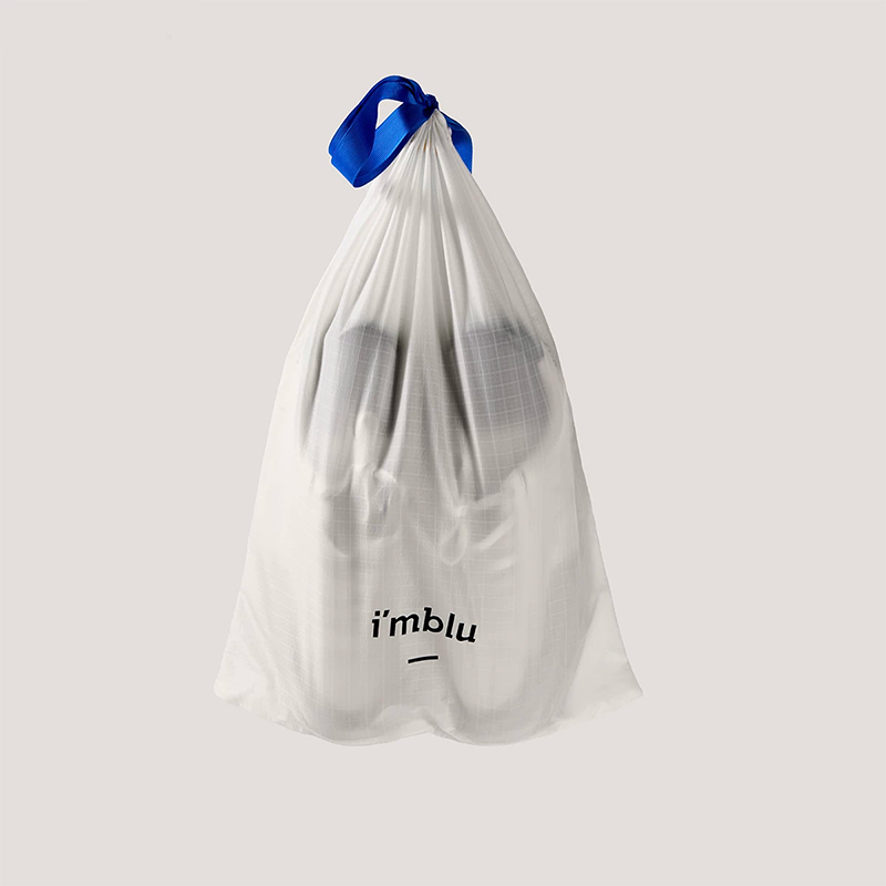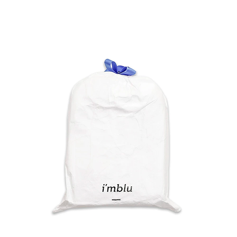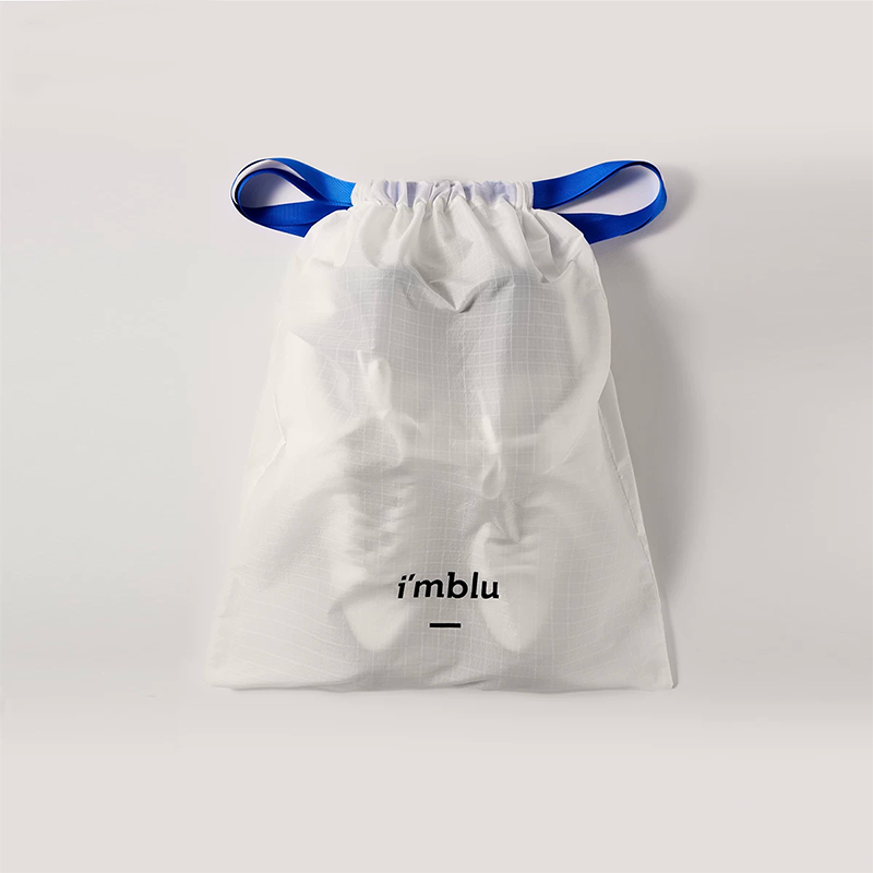 または M は、ランチ、本、または靴の履き替え用の軽量バッグとして使用できます。ブルーのウェビング ストラップは手で持つことも、両手を自由にしたいときは結んでバックパック スタイルにすることもできます。